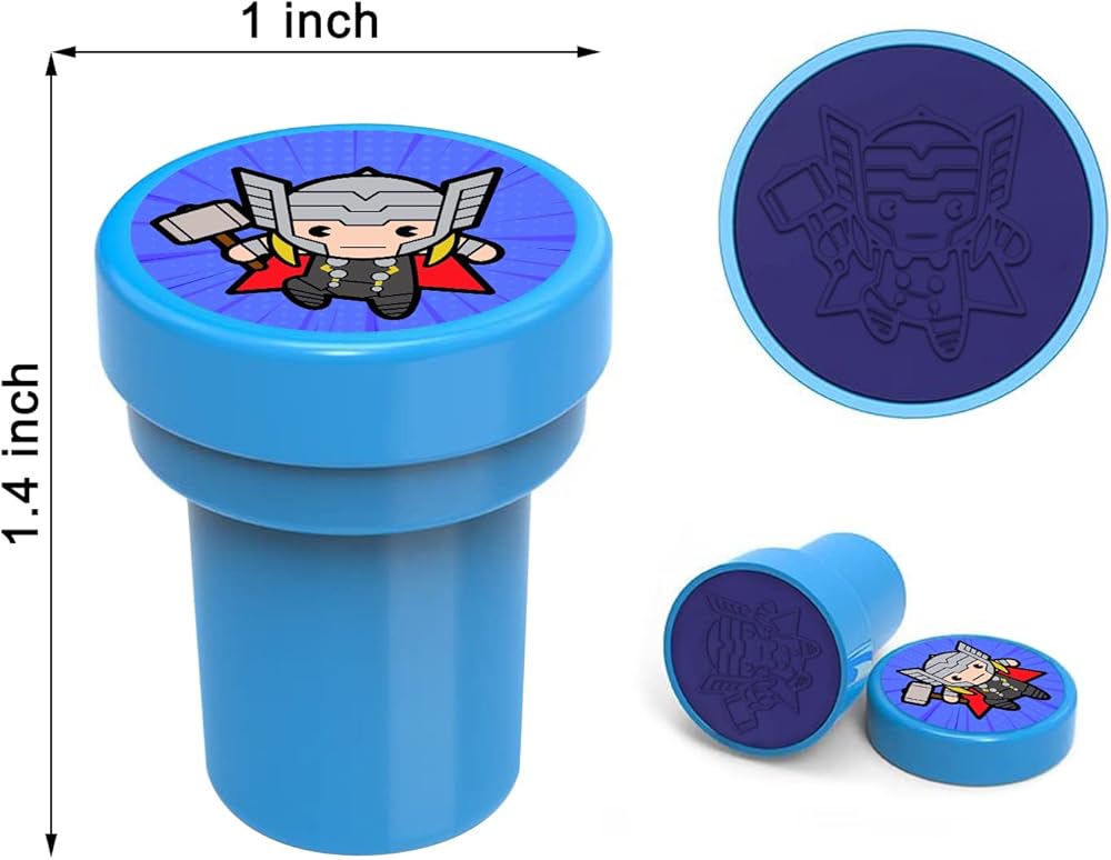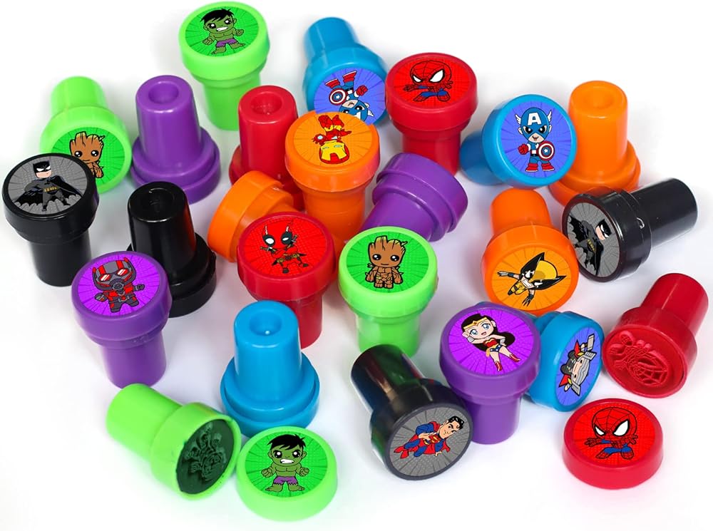 【Package Includes】 24Pcs Superhero Themed Stampers with 12 DIFFERENT designs and colors, each stampers measures 1.5 inches tall, 1 inch in diameter.