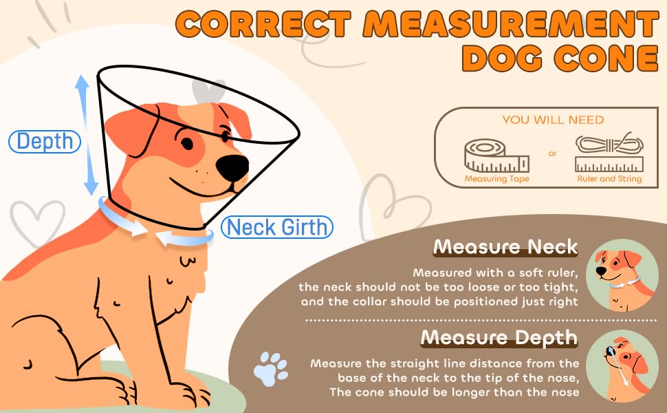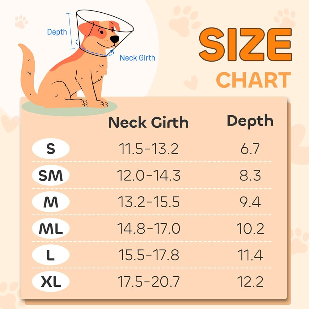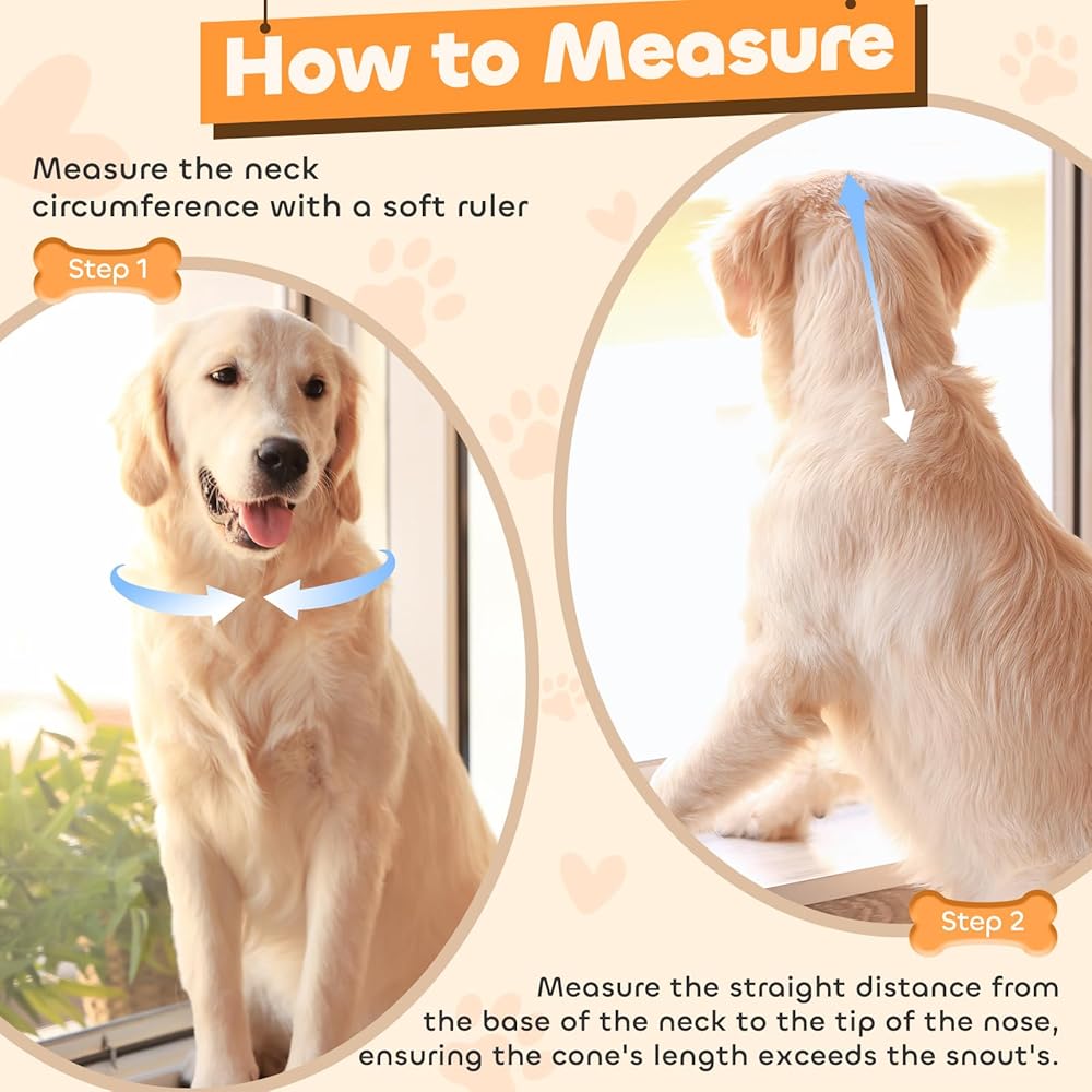 • اختر الحجم الصحيح: قبل الشراء ، يرجى قياس حجم رقبة حيوانك الأليف وطول رأسه (تأكد من أن رأس الكلب أقصر من عمق المنتج). ملاحظة --- القلق المخروط الأولي أمر طبيعي ؛ تريح الكلب الخاص بك بالعلاج أو الألعاب. لتجنب مذهل الكلب ، اضبط الفيلكرو برفق حول ذقنهم قبل تقشيره بعناية مفتوحة ، بدلاً من تمزيقه.