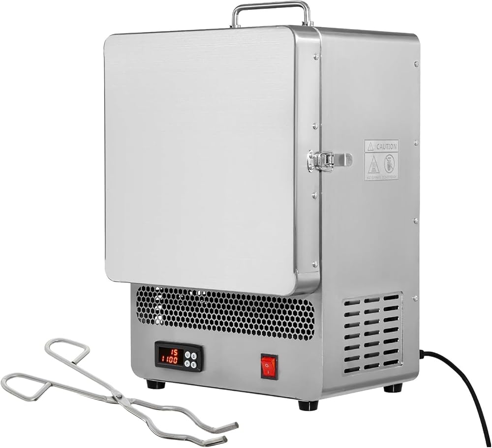 LSMIITTH tabletop kiln melter features a high-temperature-resistant furnace core that offers excellent heat insulation and corrosion resistance. With an enlarged inner space and 1500W power, the electric kiln reaches max temp in 38 minutes, maximizing heating efficiency. The heating elements are embedded on four sides (left, right, top, back), enhancing efficiency and melting metals with points below 1200°C in just 38 minutes. This electric furnace is widely used for lost wax casting, metal clay DIY projects, pottery firing, and metal tempering. It is perfect for professionals or home use. Note: Always protect yourself from high temperatures to avoid burns while working.