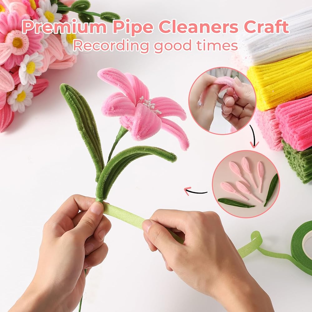 Pipe Cleaners Craft Kit: This colorful chenille stems set includes all crafting accessories for bouquets: 300 pcs different tone pink pipe cleaners, 100 pcs green pipe cleaners, 100 pcs brown pipe cleaners, 100 pcs white pipe cleaners, 30 pcs flower wires, 1 bundle of stamens, and 1 pcs of gardening tape,video tutorials. Each kit's pipe cleaners' colors are meticulously paired to guarantee the creation of floral arrangements with rich layers