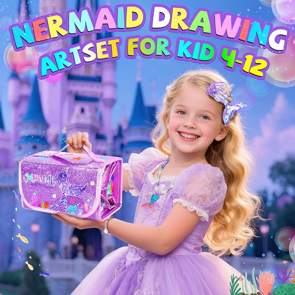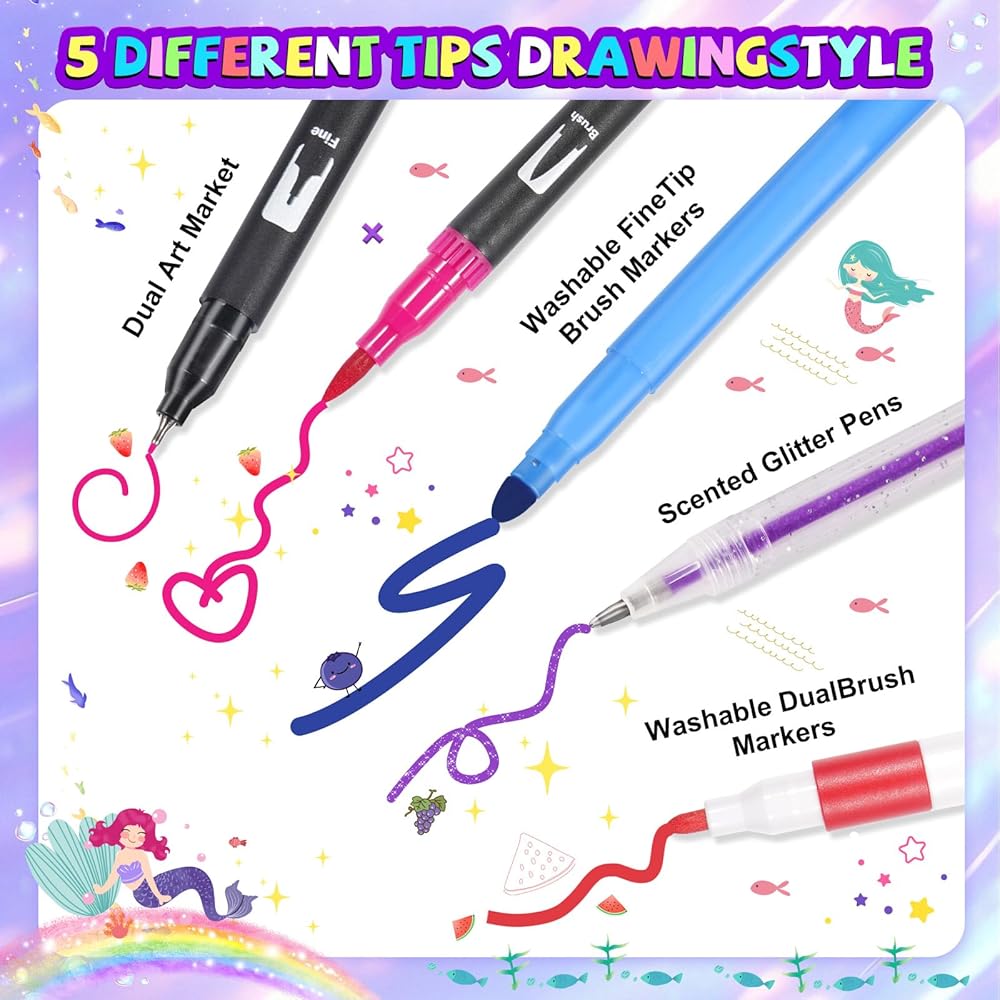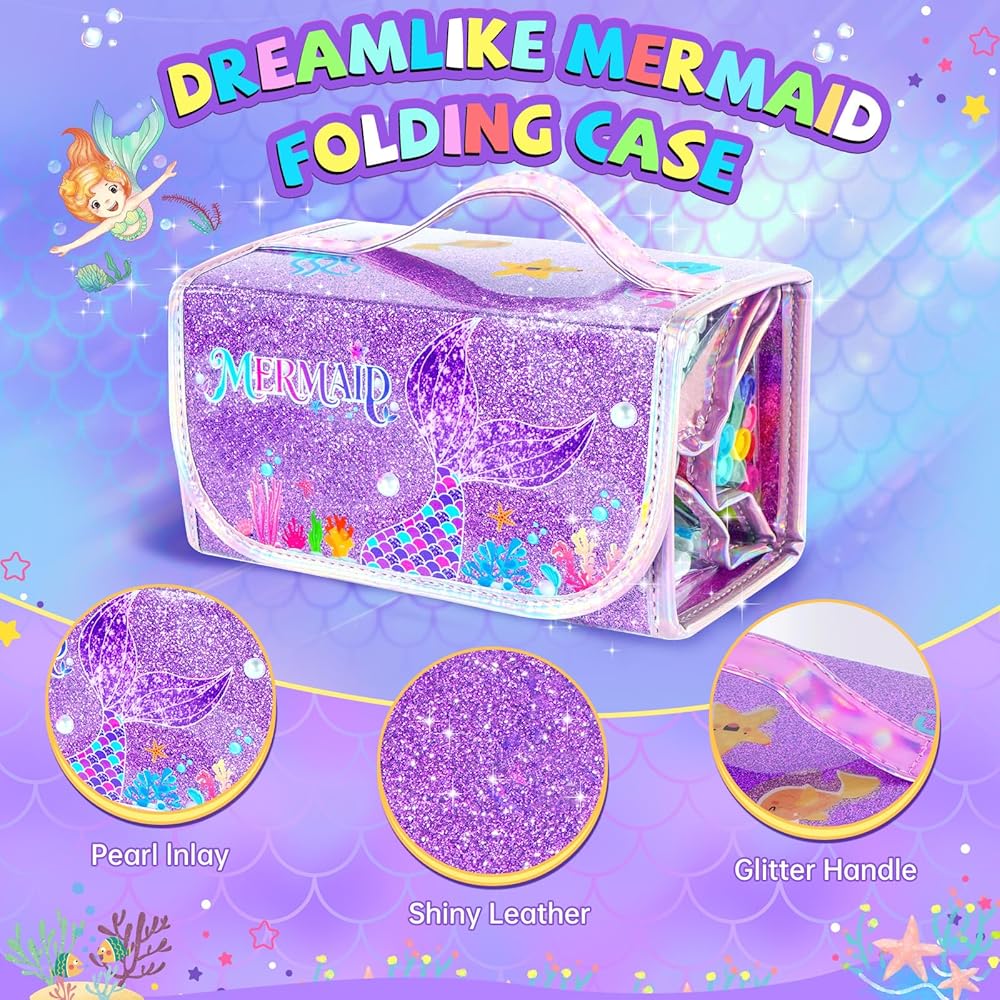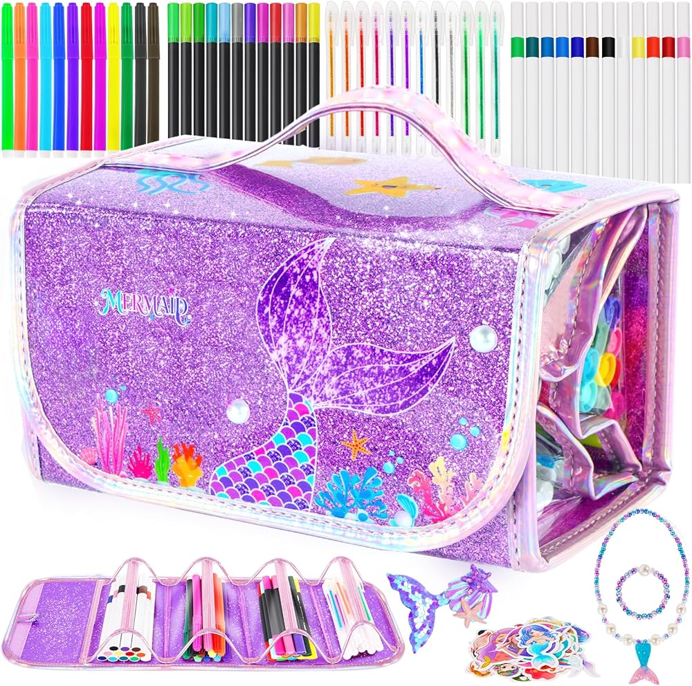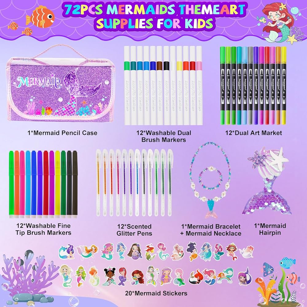 مجموعة أقلام تحديد حورية البحر قابلة للغسل 72 قطعة مع مقلمة لامعة، لوازم فنية للأطفال من سن 4-6-8، مجموعة تلوين الحرف الفنية مع ملصقات ومجموعة مجوهرات - هدايا عيد ميلاد للفتيات 4 5 6 7 8 9 سنوات