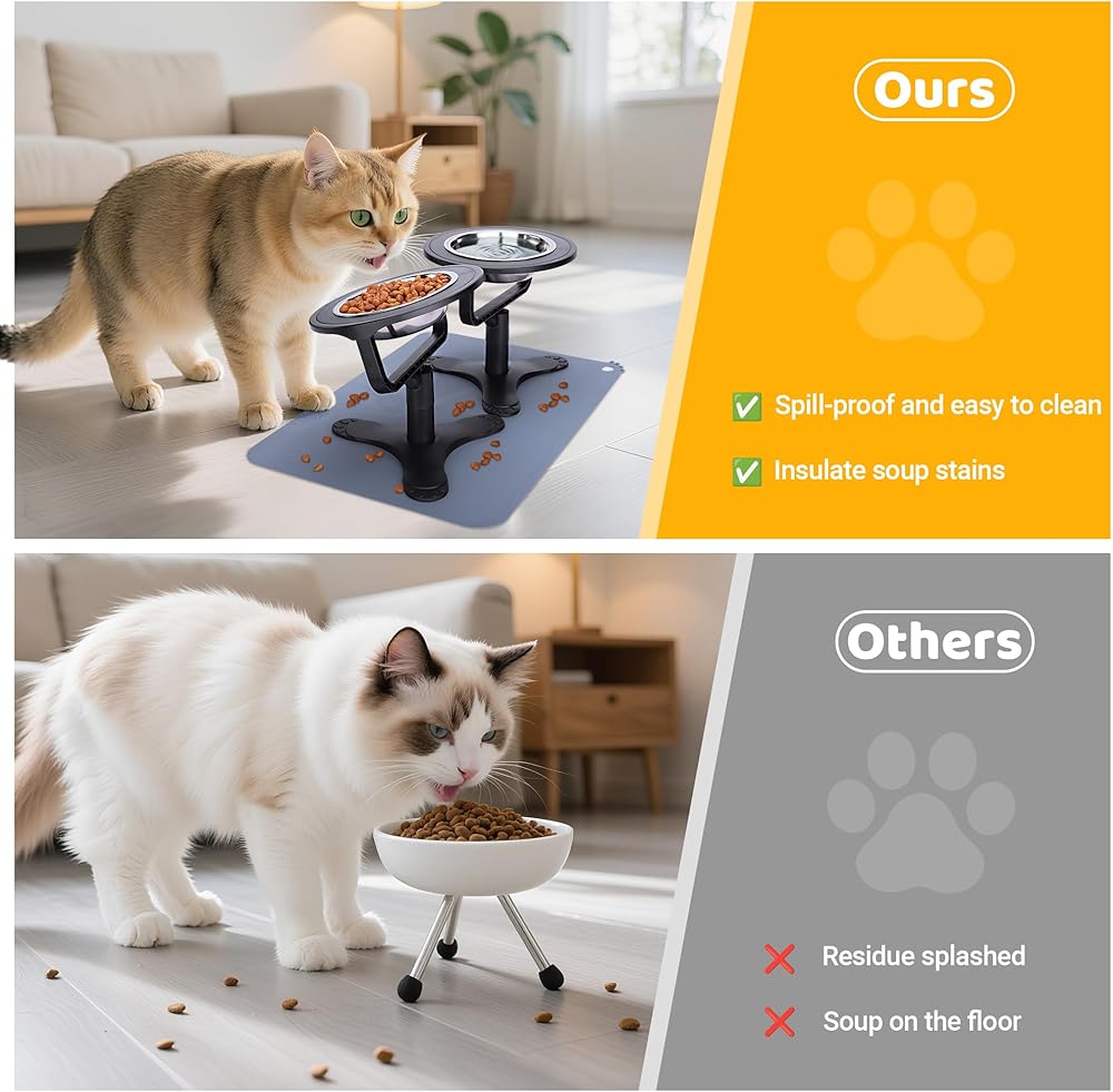 【Silicone Spill Proof Food Mat】This cat food stand comes with a 17x11.8-inch silicone food mat that effectively prevents food and water spills from falling onto the floor, keeping the dining area clean. Easy to clean, simply rinse with running water