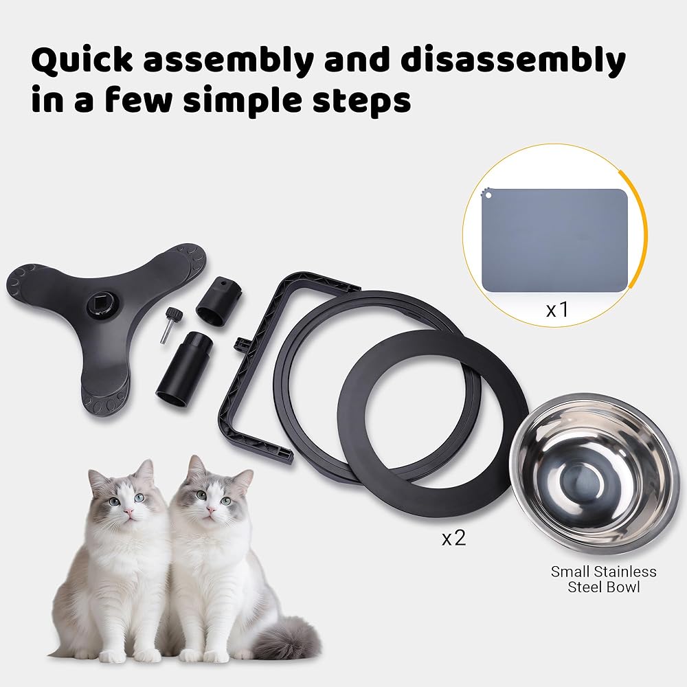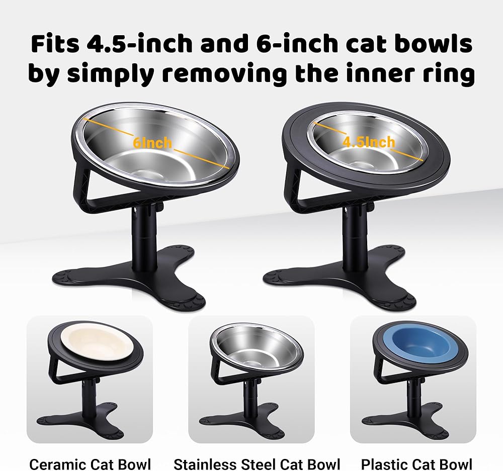 【Dual-size Bowl Compatibility】Simply remove the inner ring to switch the fixed width from 4.5 inches to 6 inches. The bowl can securely hold bowls made of ceramic, stainless steel, or plastic. You can choose the appropriate bowl based on your cat's appetite and preferences