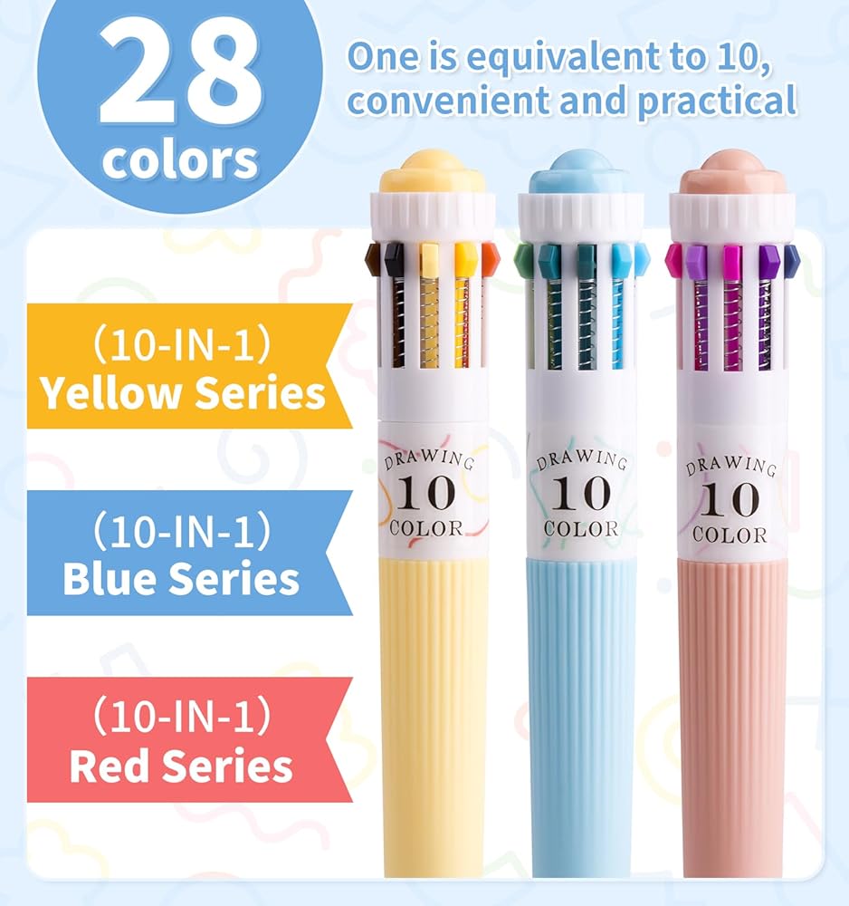 【28 قلم حبر متعدد الألوان ملون】 مضمن في هذه المجموعة 3 قطع من أقلام حزمة بلون 10 في 1 (1 قطعة من الأصفر ، 1 قطعة من اللون الأحمر ، و 1 قطعة من الأزرق). تتميز الأقلام الثلاثة ذات الألوان المتعددة 28 لونًا بالحبر (28 لونًا مختلفًا بين ثلاث أقلام) ، وتلبية احتياجات الألوان الخاصة بك. يضيفون الإبداع إلى اليومية والملاحظات والفن الخاص بك.