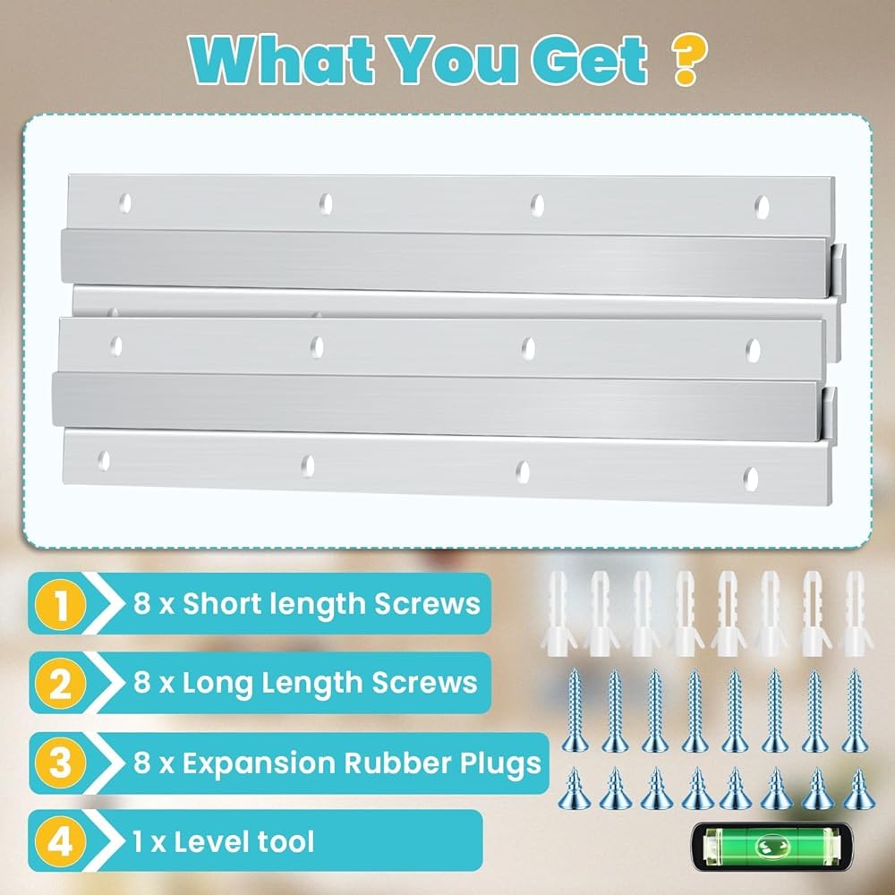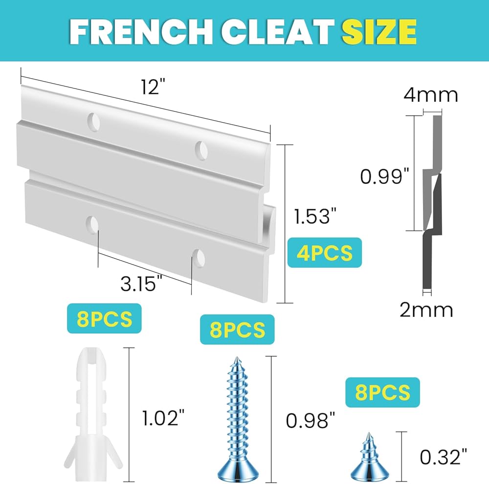 ما ستحصل عليه: تتضمن الحزمة 1 Cleat الفرنسية من Aluminium Cleat ، ومسامير قصيرة 4 × ، ومسامير طويلة 4 × ، وأنابيب تمدد 4 × ، وأداة 1 × المستوى ، بما في ذلك جميع الملحقات اللازمة للتثبيت السريع والسهل.