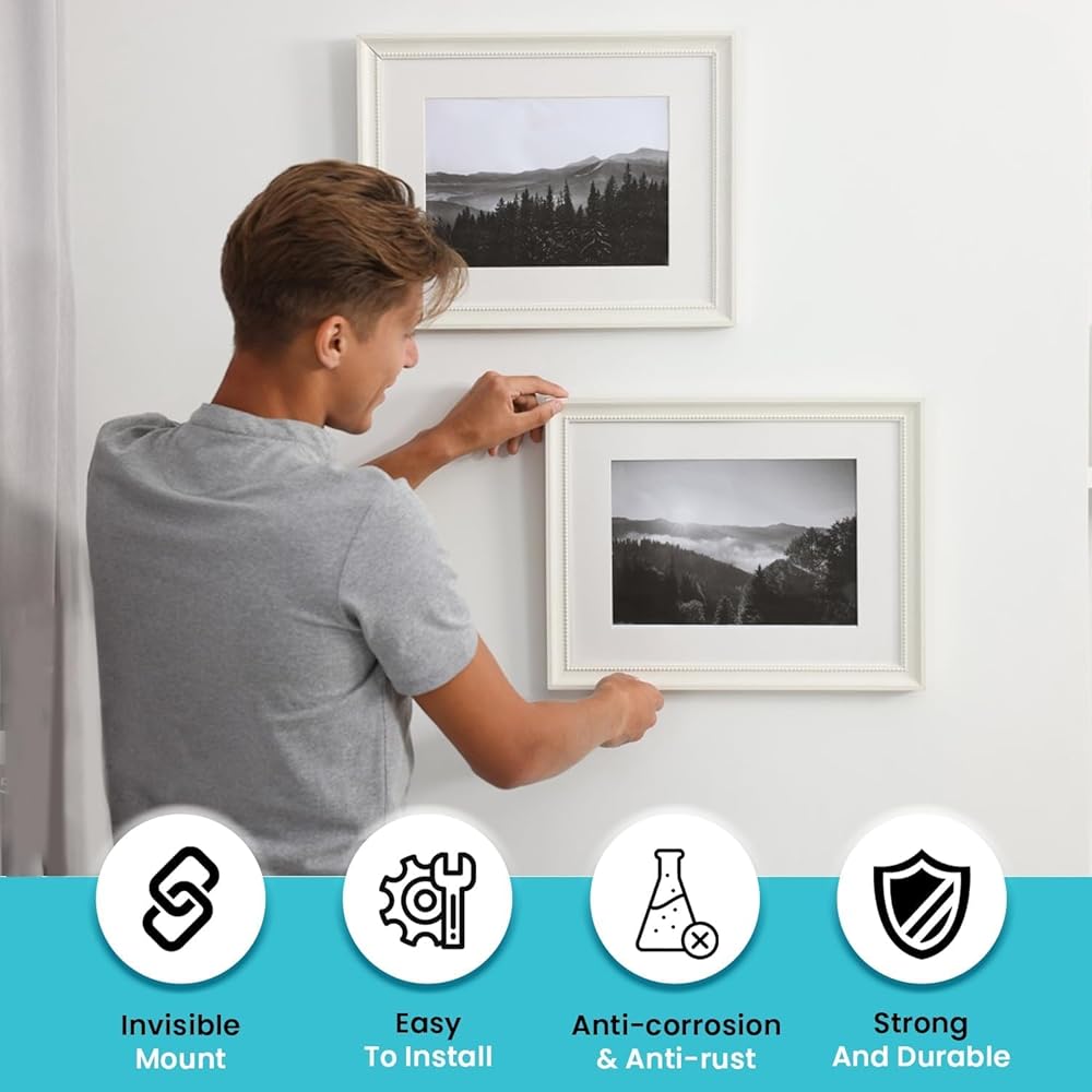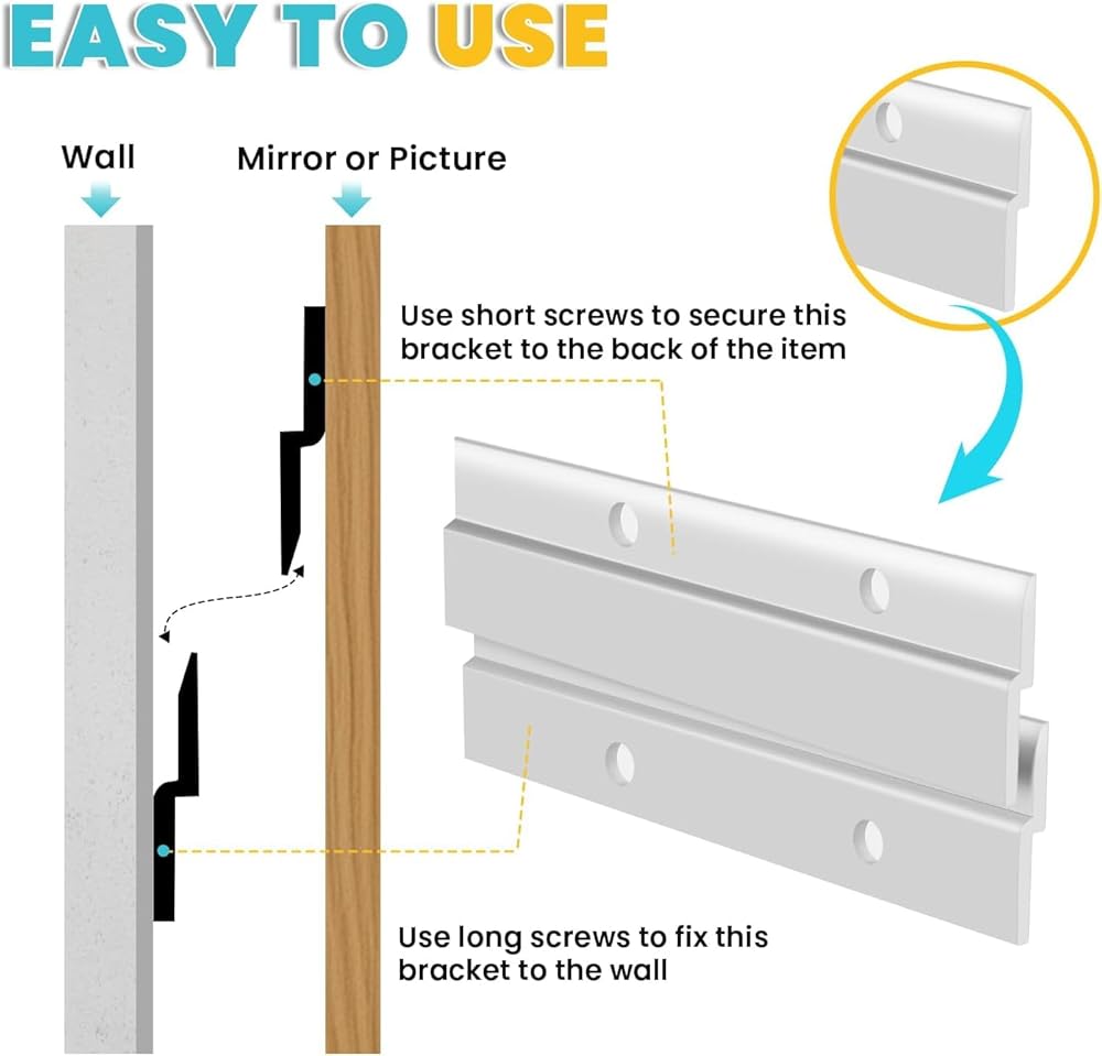 مواد عالية الجودة: يتكون شماعات المربط الفرنسية من سبيكة الألومنيوم وتسمح بالاستخدام على الجدران غير العمودية ، مما يوفر دعمًا أفضل وسلامة معززة للوحات أو مرايا فنية ثمينة.
