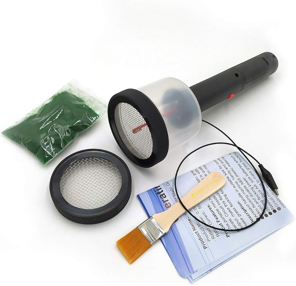 The static grass applicator has two net covers for flocking grasses of different sizes and lengths.