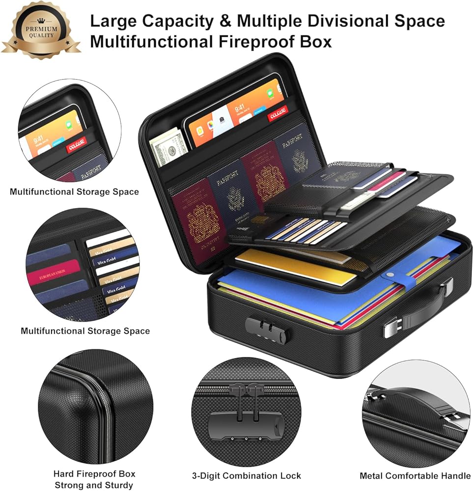 تصميم متعددة سهلة الاستخدام SAFE - تصميم الأكياس الآمن مع مقبض الاستيلاء قوي لحمل حقيبة المستندات المقاومة للحريق بسهولة ؛ 2 الطريق السحري المقاوم للماء يجعل من الأسهل فتح وإغلاق حقيبة الملفات ؛ تم تصميم الأقفال المركب لجعل تصميمات الأسلحة الأوسعة أكثر أمانًا وأوسع نطاقًا على ظهرها يتيح لك إدخال مقبض حقيبة.