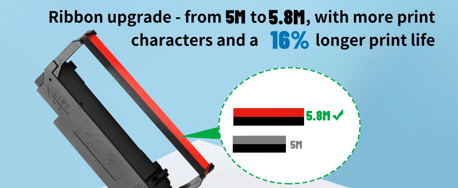 EXTENDED LIFESPAN: The rbbons length is 5.8m , which is 16% longer than the standard length of 5m, reducing the frequency of replacement and saving costs