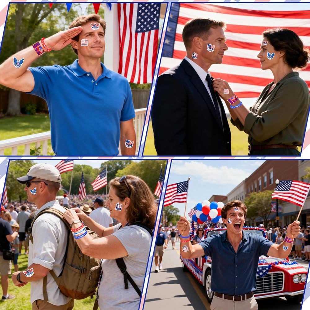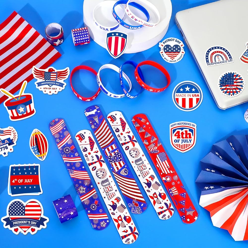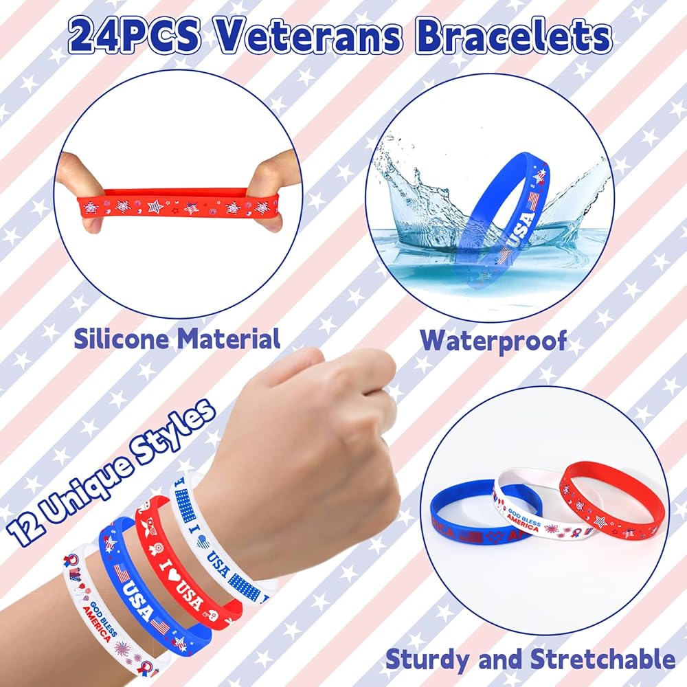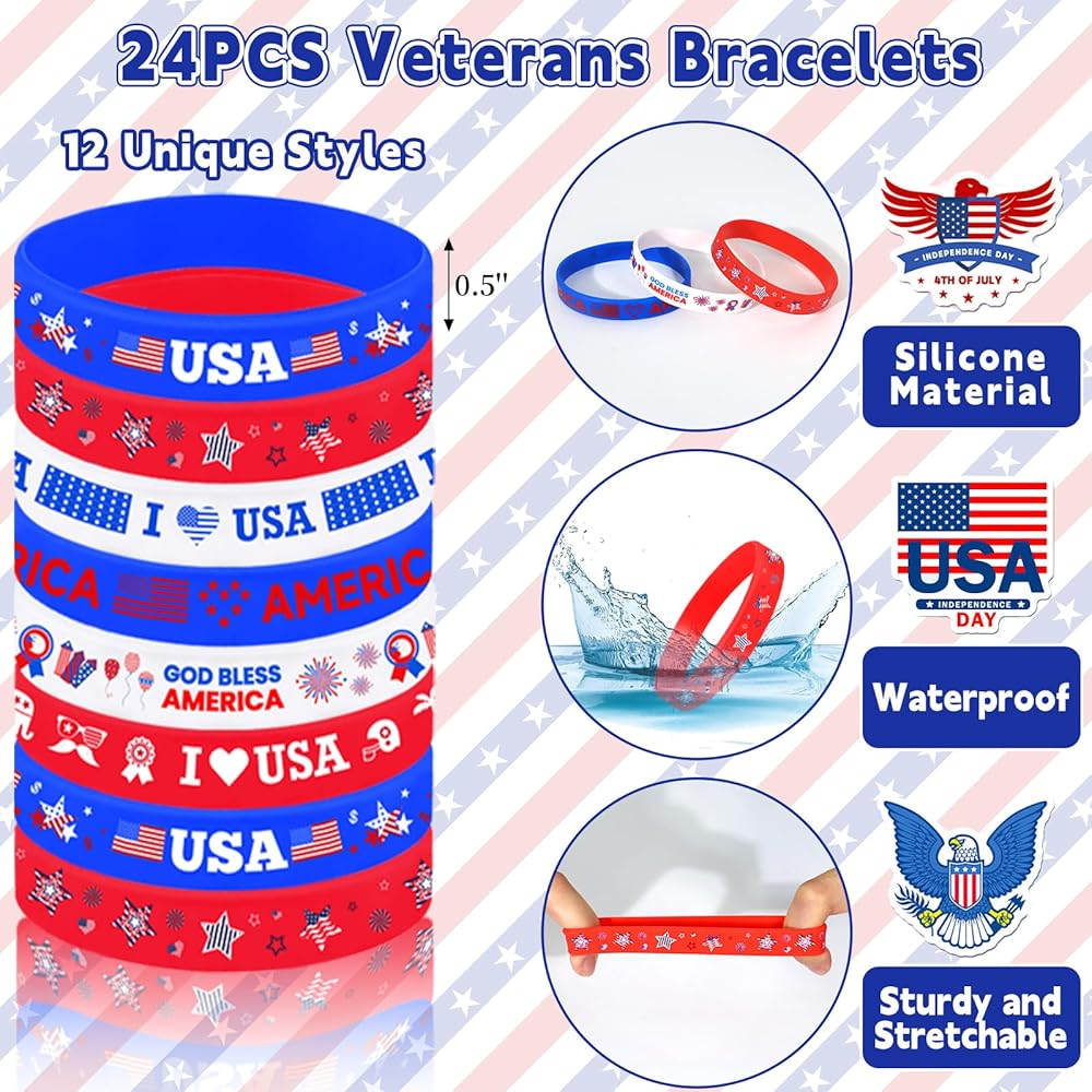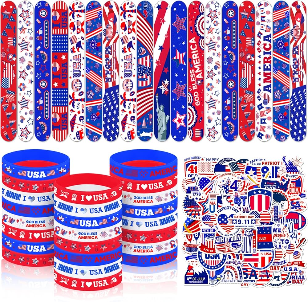 93 قطعة من هدايا حفلات يوم المحاربين القدامى - هدايا الحفلات الوطنية مع أساور سيليكون باللونين الأحمر والأبيض والأزرق وملصقات أساور هدية للمحاربين القدامى في الولايات المتحدة الأمريكية في الرابع من يوليو
