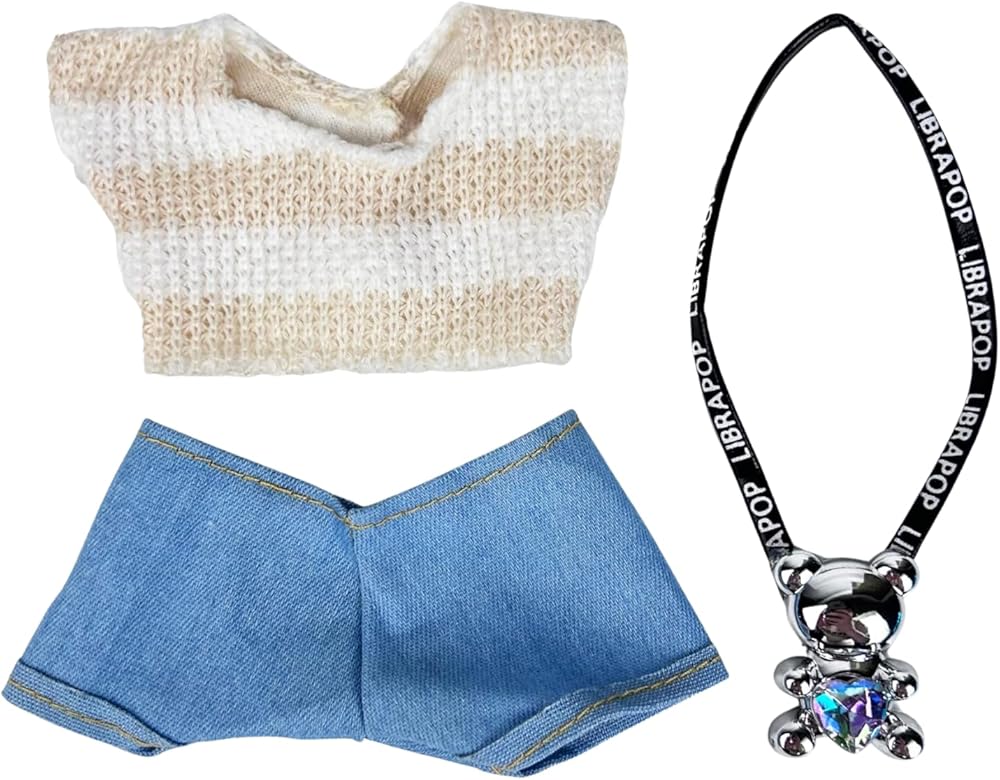 COMPLETE OUTFIT: 3-piece doll clothing set featuring a striped knitted crop top, blue denim shorts, and a decorative bear pendant necklace for 17cm fashion dolls