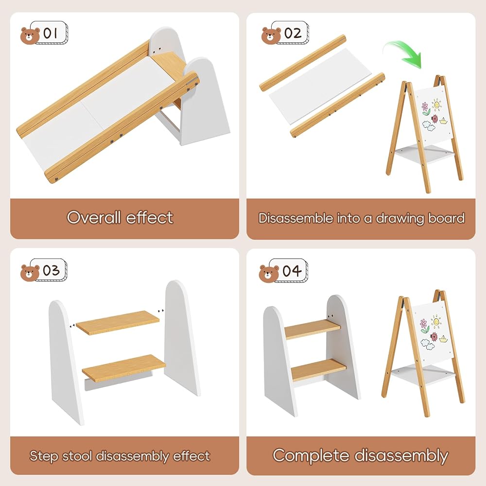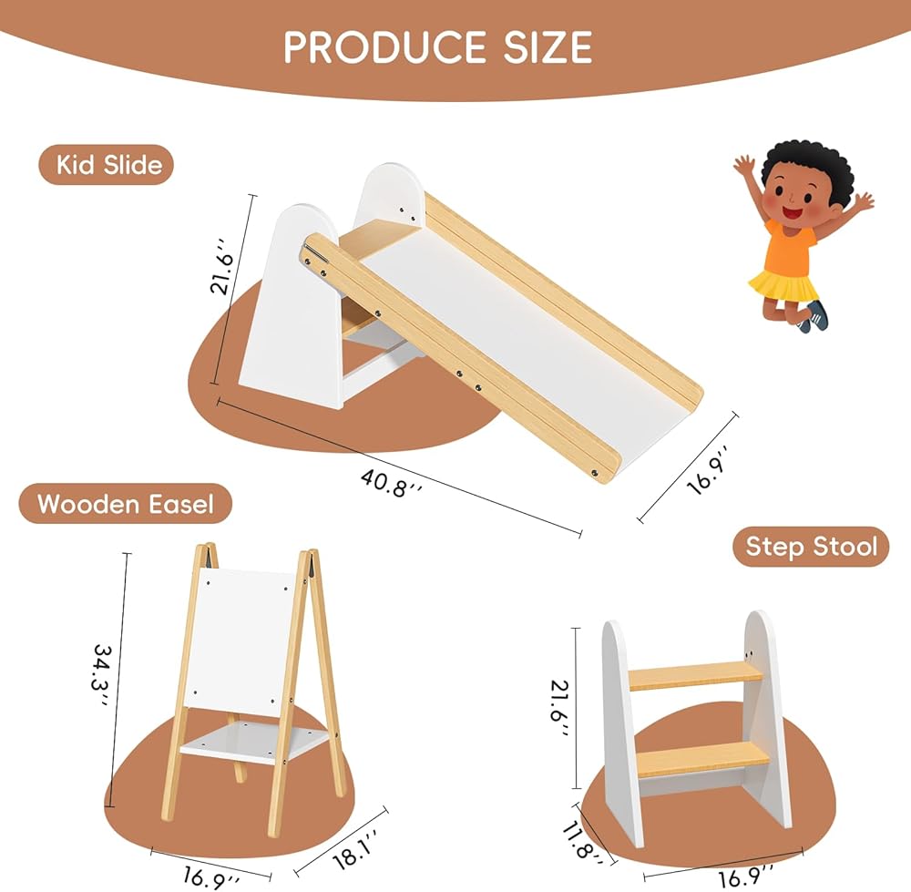 • أبعاد المنتج: الحجم الكلي للشريحة للأطفال الصغار 1-3: 40.8x16.9x21.6 بوصة. حجم الطفل easel: 16.9x18.1x34.3 بوصة. حجم البراز الخطوة: 16.9x11.8x21.6 بوصة. ملاحظة: أنت بحاجة إلى إعادة تجميع وتفكيك لتحويل شريحة الأطفال إلى حامل