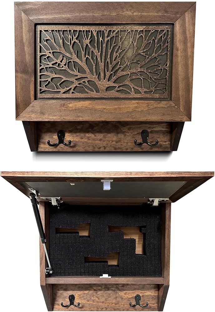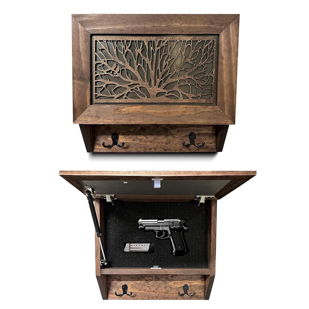 تصميم مستوحى من الطبيعة المصنوع يدويًا: يتميز بطيور مفصلة في تصميم الأشجار ، يجمع ديكور جدار تخزين الأسلحة الخفي هذا الفن ويعمل معًا. المصنوع يدويًا في الولايات المتحدة الأمريكية بعناية مملوكة للعائلة ، فإنه يخفي سلاحك الناري في قطعة تعزز أي غرفة.