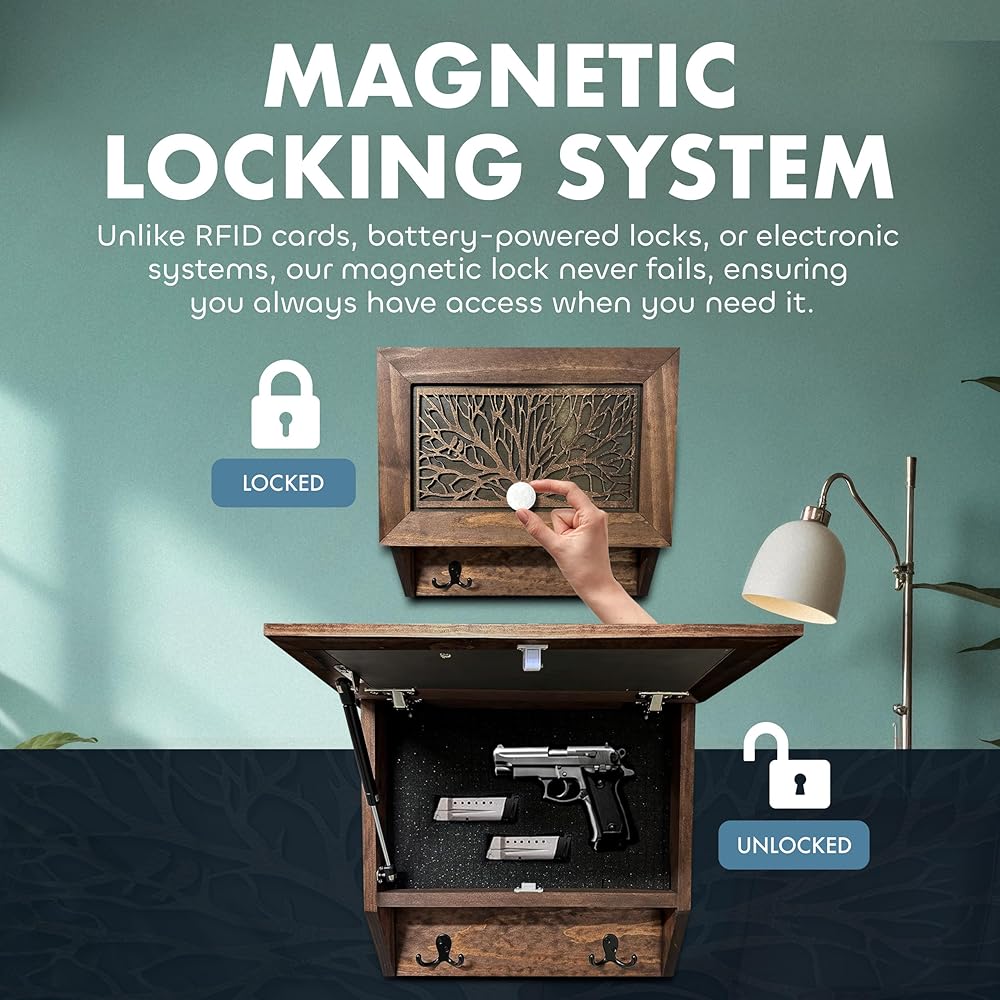 تأمين القفل المغناطيسي: يستخدم أثاث إخفاء البندقية هذا نظام مفتاح مغناطيسي لا يفشل أبدًا عند الحاجة. على عكس أقفال البطارية أو Biometric أو RFID ، فإنه يوفر تخزينًا مخفيًا للبنادق مع وصول آمن وموثوق في كل مرة وراحة البال دون فشل تقني.