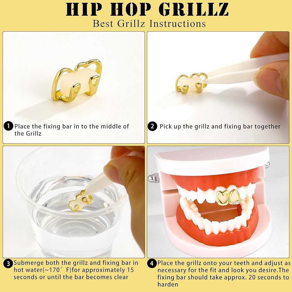 مجوهرات أسنان الشواء: استخدام أغطية الأسنان الذهبية للأسنان الأمامية أمر سهل ومريح بمساعدة التعليمات. مع المزيل ، يمكنك وضع Grillz وإقلاعها دون لمس يديك ، مما يجعل العملية أكثر نظافة وأكثر صحة. كل شووع ذهبي لديه قطعة سيليكون في الوسط ، مما يساعد على منعها من التعرف على سحقها أو تشوهها أثناء النقل