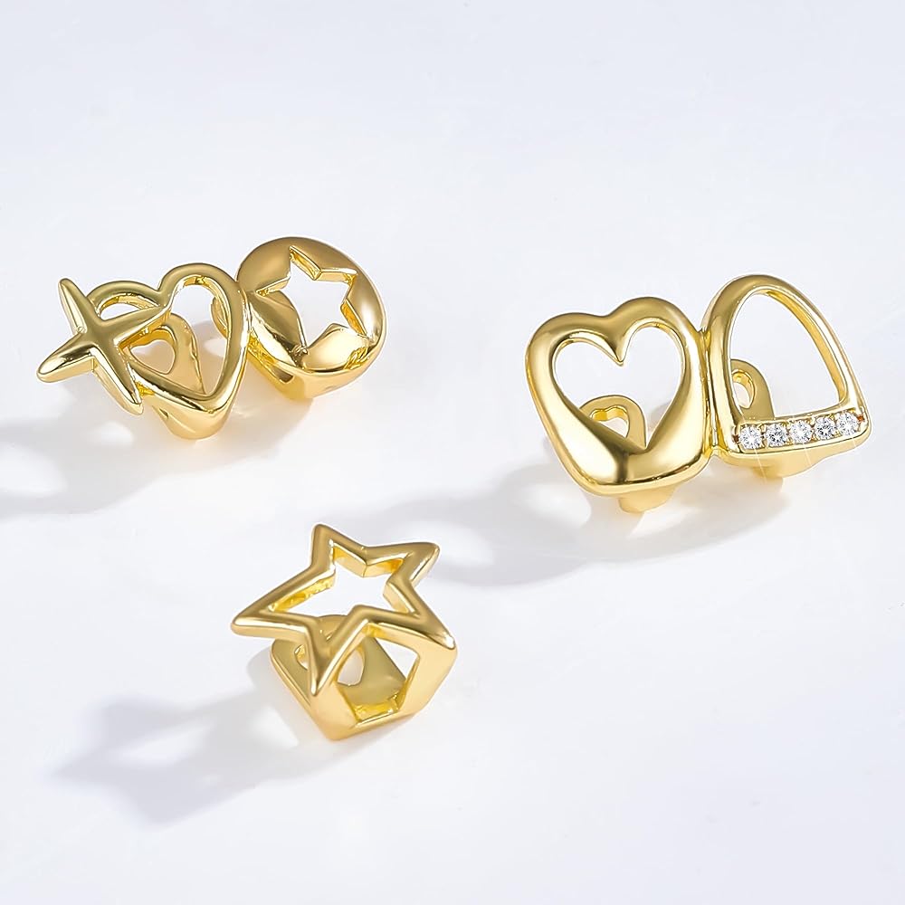مجموعة Golden Grillz: تتكون مجموعة واحدة من مزيل 1 ، و 1 instruction و 6 أنماط مختلفة من أغطية الأسنان الذهبية ، بما في ذلك أزواج من شوايات الأسنان المجوفة على شكل قلب و 4 شوايات أسنان واحدة تتميز بلكنات الراين على الطراز الشرير مع الصليب ، وتصميمات قطع النجوم. هناك العديد من الأنماط في مجموعة واحدة ، ويمكنك مطابقةها بحرية وفقًا لتفضيلاتك الخاصة. ارتداء وإزالة شوايات الأسنان سهلة ومريحة.