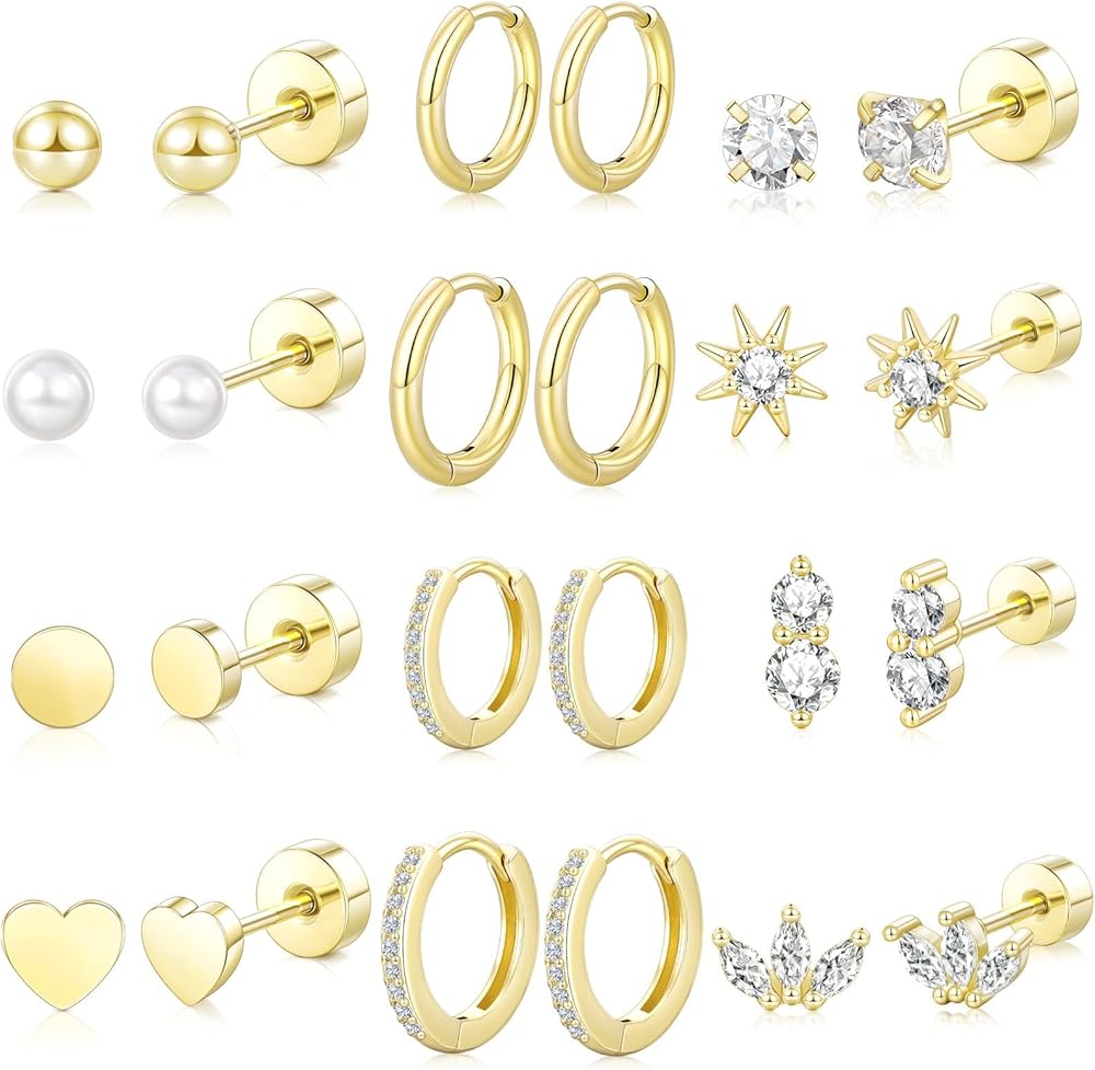 مجموعات القرط لأحجام ثقب متعددة: المقياس هو 20 جرام (0.8 مم) ، طول ما بعد 7 ملم ، حجم الظهر المسطح هو 5 مم. الكرة/CZ/Pearl/DOT/IS 3MM. القلب 4 مم. النجم هو 7x7mm. الأوراق 6x9mm. 2CS هو 5x8mm. الأطواق القطر الداخلي: 8mm/10mm. سواء كنت تبحث عن مجموعة مسمار أنيقة أو بعض أطواق Bling Huggie ، فإن مجموعة الأقراط الذهبية هذه ستناسب الفاتورة.