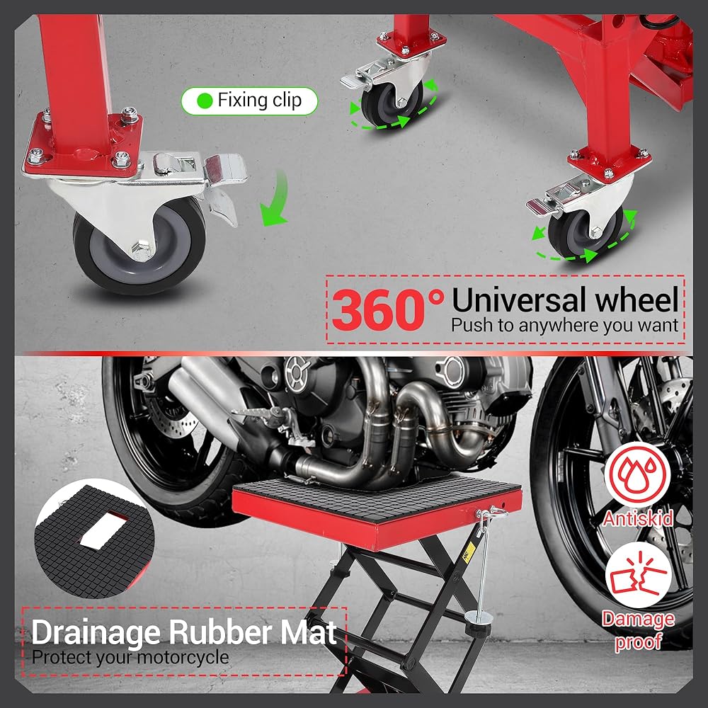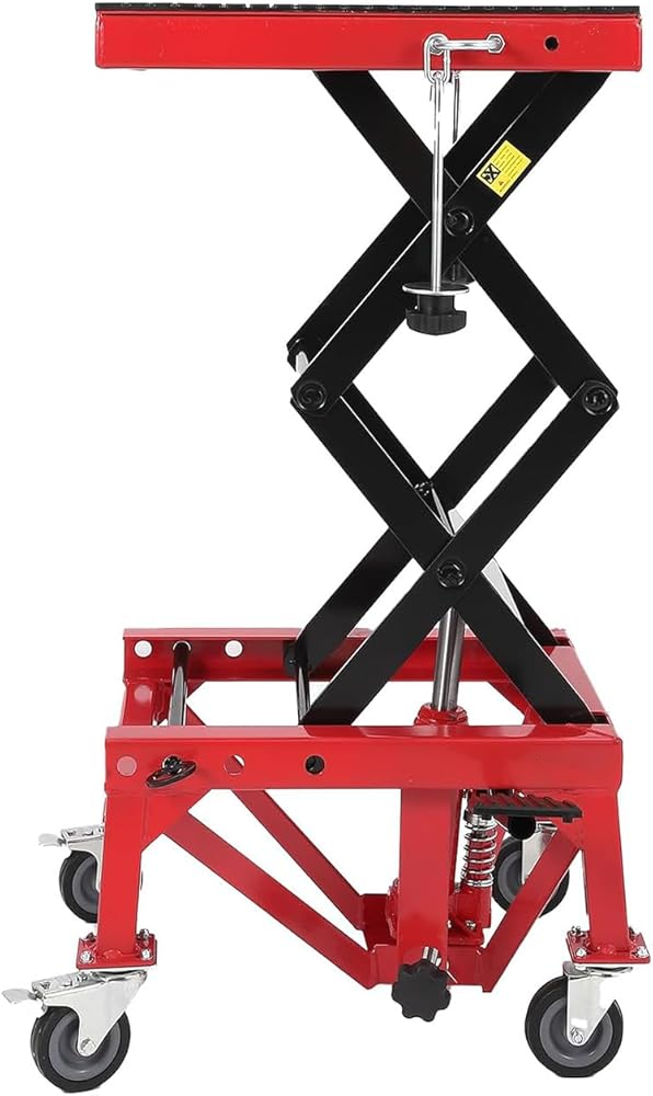 Whether you're performing routine maintenance or complex repairs, this hydraulic motorcycle lift jack is built to provide reliable support and convenience. Its sturdy construction and durable materials ensure long-lasting performance, while the foot-pump operation frees your hands for other tasks. Upgrade your workshop with this multifunctional, heavy-duty motorcycle repair jack and experience the ease and efficiency it brings to your motorcycle care routine.