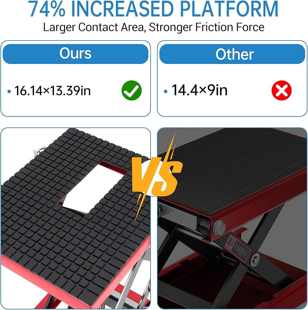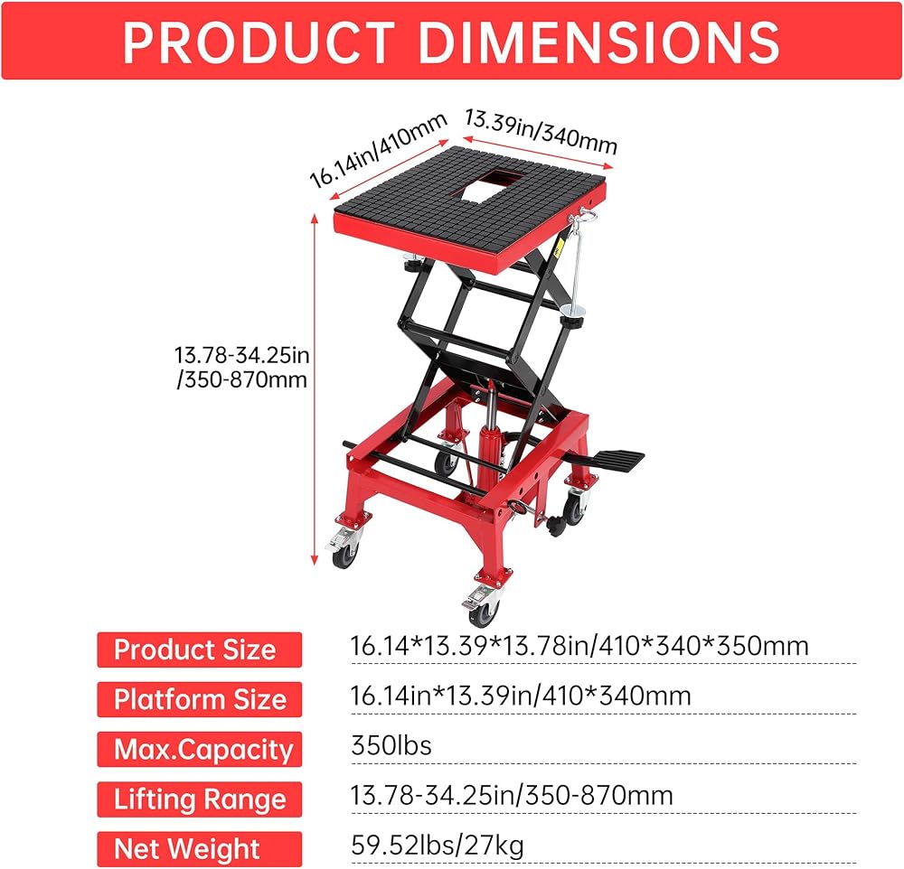 Heavy-Duty 350 lbs Capacity & Solid Steel Frame: High-strength worm gear transmission and scissor structure ensure secure lifting for motorcycles, ATVs, and dirt bikes.