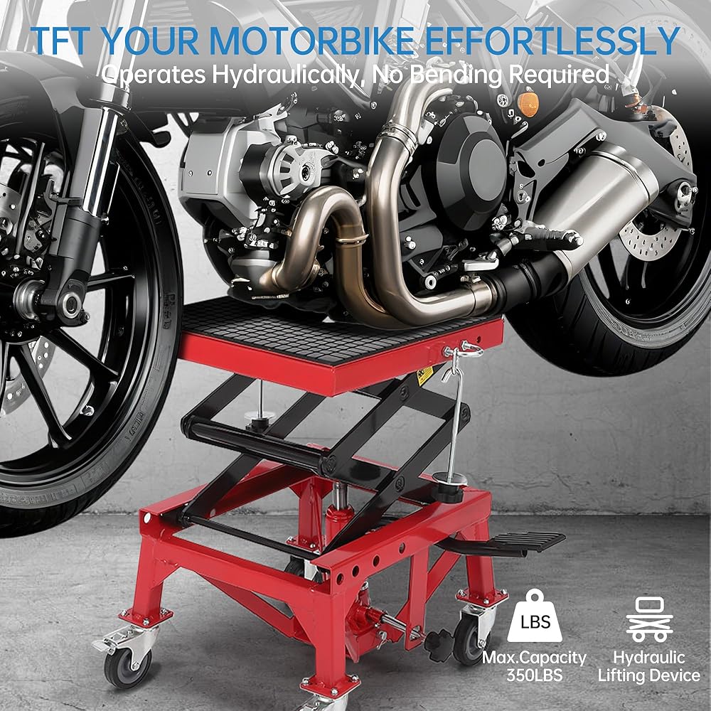 Introducing the Hydraulic 350LBS Motorcycle Lift Jack, the ultimate solution for all your motorcycle maintenance and repair needs. Designed to accommodate ATVs, dirt bikes, cruisers, and more, this versatile lift jack offers a robust 350 lbs lift capacity, ensuring it can handle a wide range of motorcycles and small vehicles with ease. Featuring a foot-operated hydraulic system, it allows for smooth, effortless lifting without the need for manual cranking. The scissor table design provides excellent stability and support, while the adjustable height range from 13.78 to 34.25 inches ensures you can work comfortably at the perfect height.