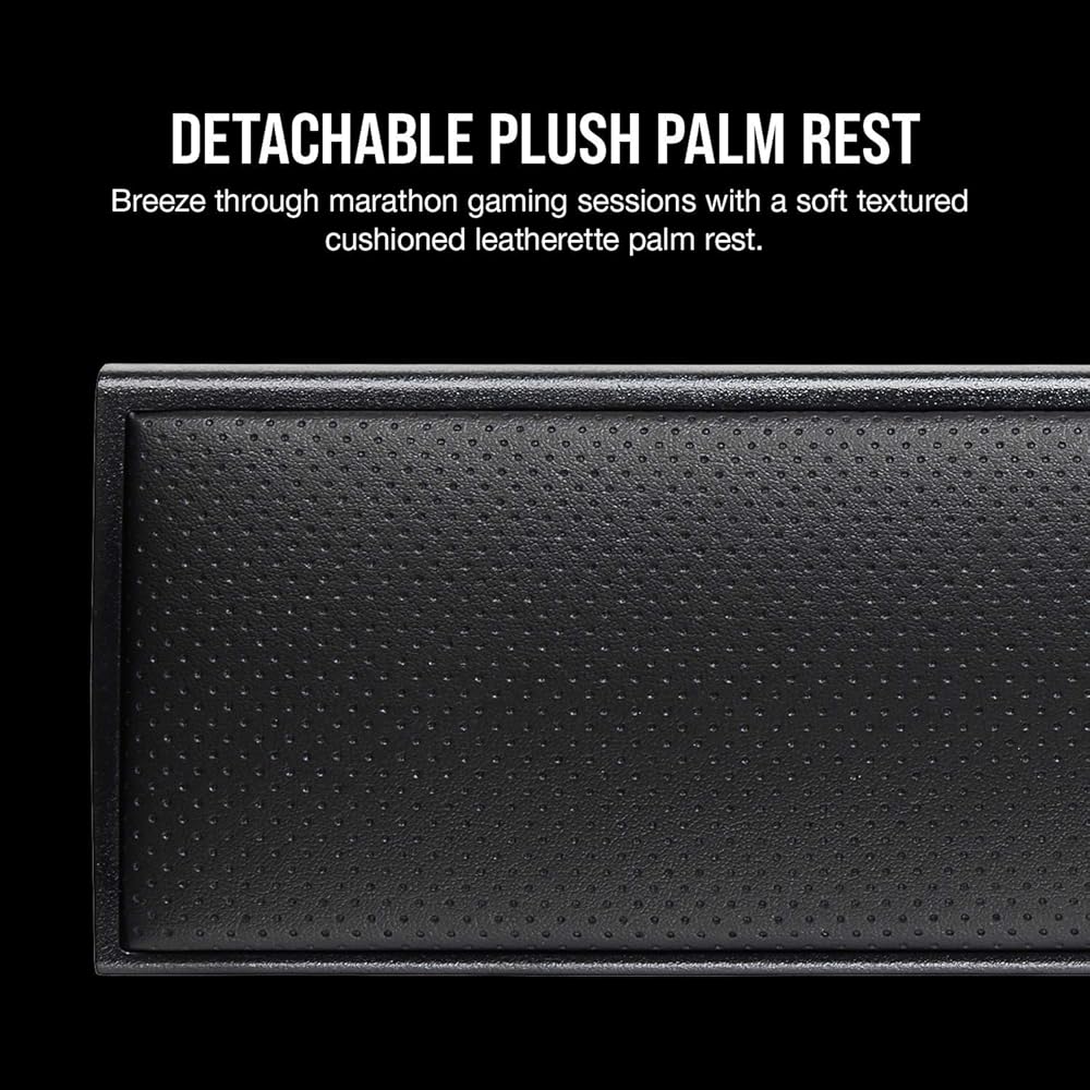 A detachable soft textured cushioned leatherette palm rest offers the plush comfort to breeze through marathon gaming sessions