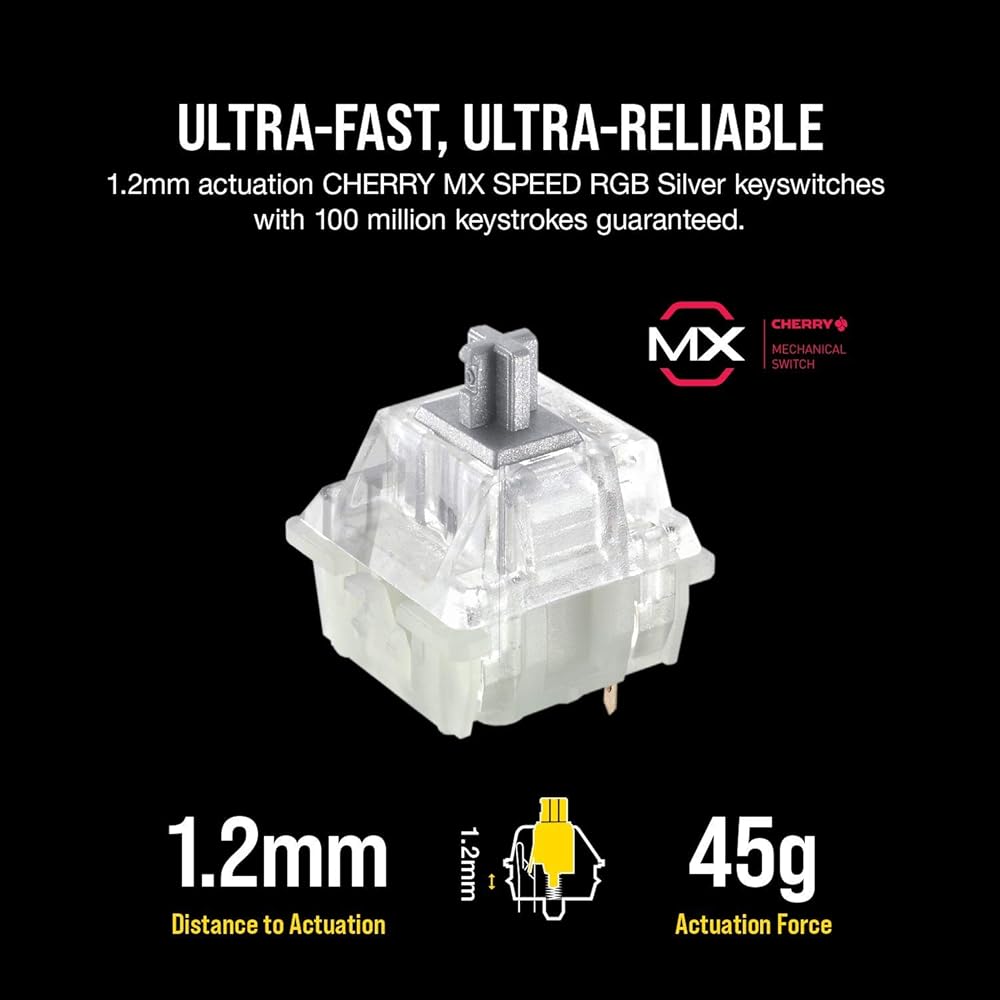 Cherry MX Speed RGB Silver mechanical key switches provide ultra-fast 1.2 millimeter actuation and proven reliability with 100 million keystrokes