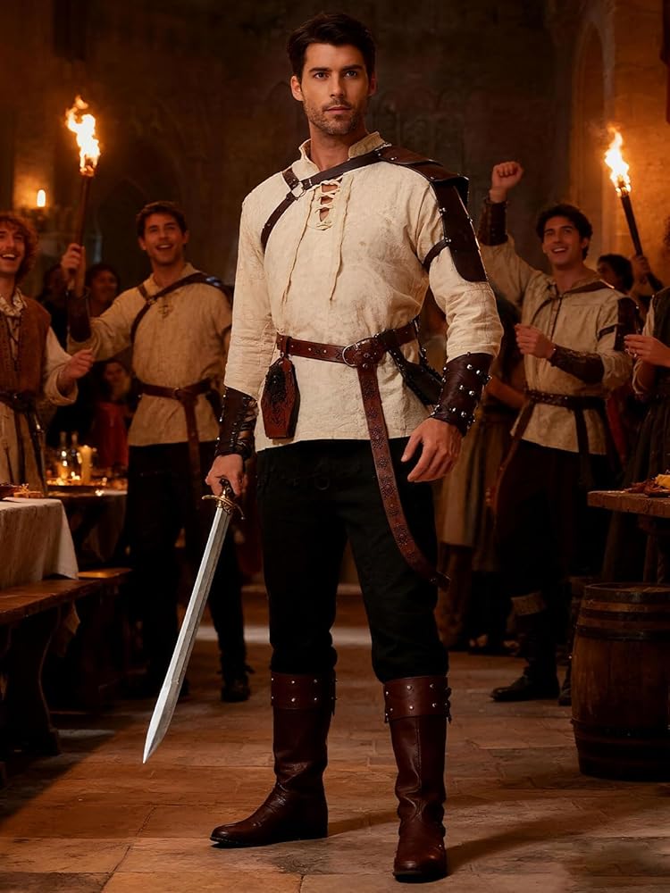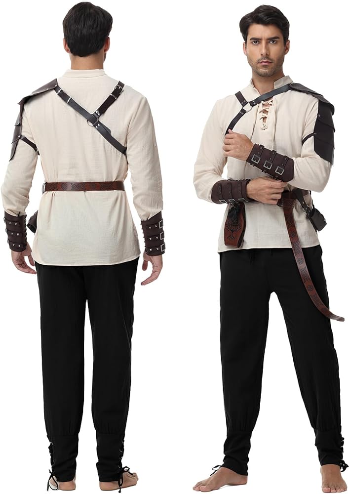 مجموعة أزياء عصر النهضة الكاملة: يشمل هذا الزي الشامل في العصور الوسطى قميصًا وسروالًا وحزامًا فايكنغ وزوج من الحواس والأغنب وحقيبة الخصر ودروع الكتف. مع وجود كل ملحق أساسي ، يمكنك التحول على الفور إلى فارس أو قرصنة أو فايكنغ دون الحاجة إلى عمليات شراء إضافية
