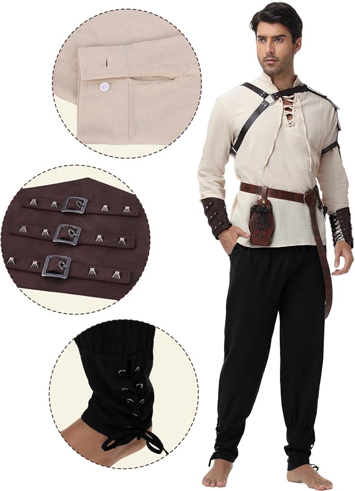 مواد مريحة ودائمة: مصنوع من قميص وسروال عصر النهضة من مزيج من القطن البوليستر الناعم ، مما يوفر راحة طوال اليوم. تم تصميم ملحقات القرون الوسطى من جلد PU عالي الجودة مع خياطة قوية ، مما يجعلها مقاومة للارتداء ، متينة ، وطويلة الأمد