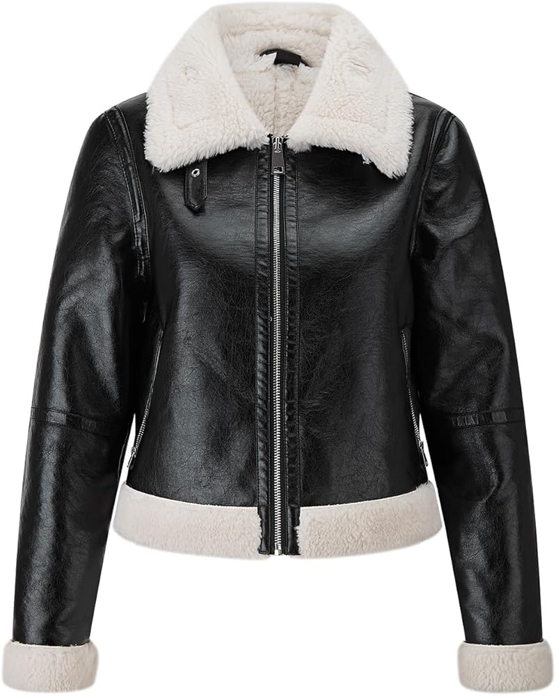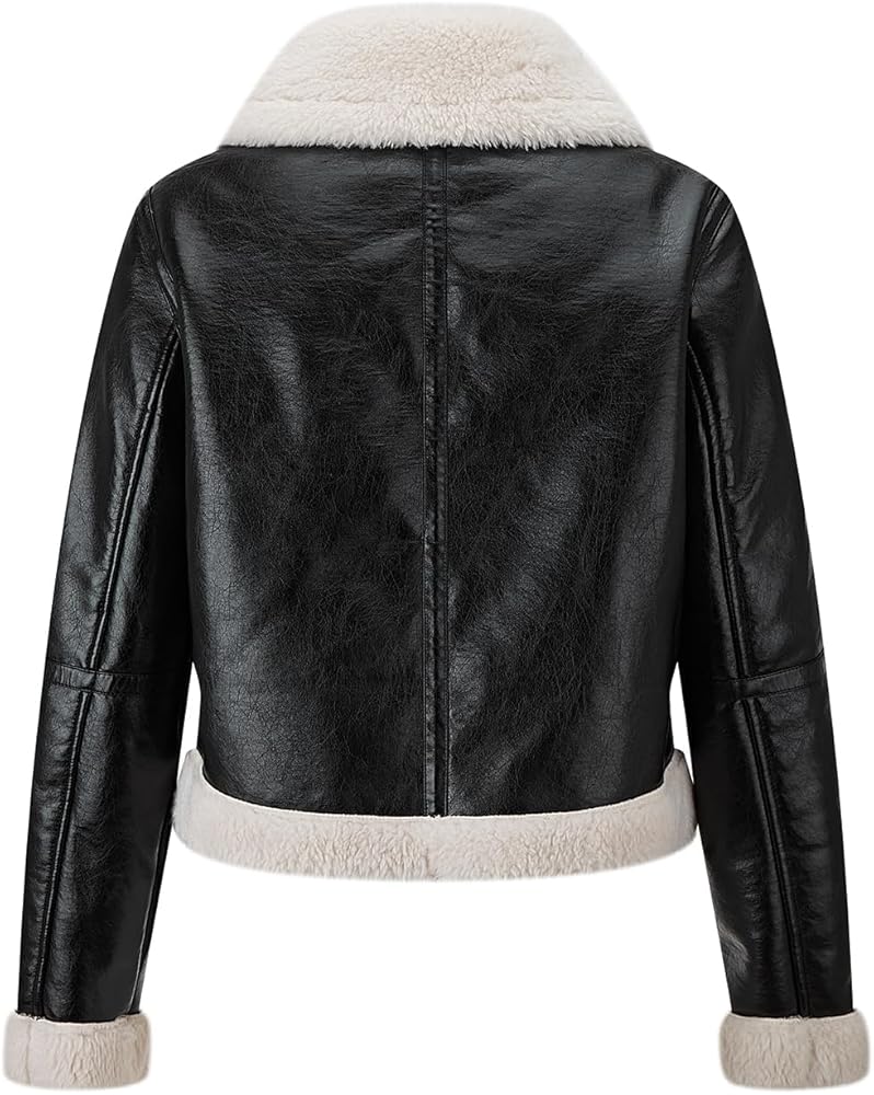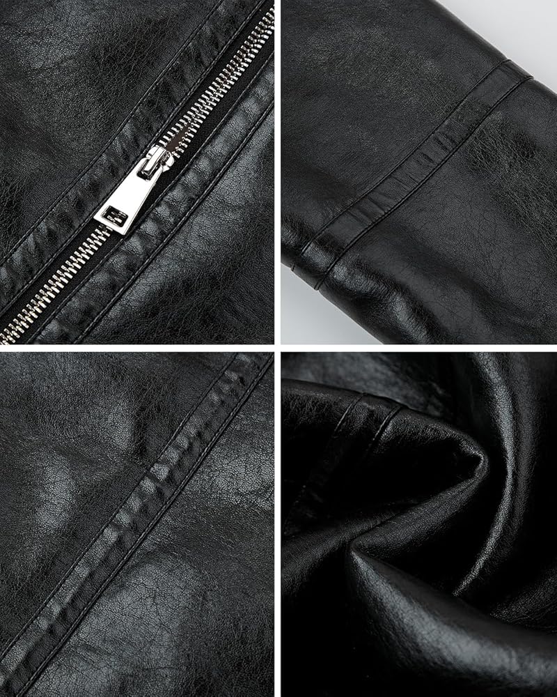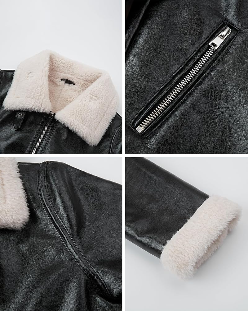 【Cropped Design】We have improved on the original style. This jacket is slightly shorter and only reaches the waist, adopting a short slim fitting fashion style. With straight front zipper and zippered pockets on both sides, this cropped fur - leather composite motorcycle jacket allows you to stay warm and release the wind without losing your unique personality, adding more unique and fashionable elements in winter.