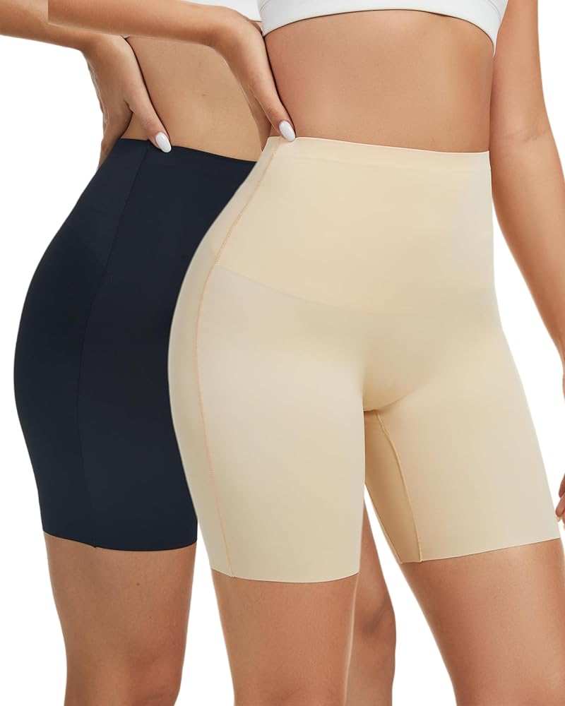 Breathable&Comfortable Material for Under Dress Shapewear:High waisted cooling shorts for women under dresses is made of 80% Polyamide 20% Elastane fabric,spandex shorts women under dress with ice silk smooth fabric,smooth touch which is breathable and comfortable and give you silky soft and delicate enjoy,extended safety undergarment crotch design and anti chafing shapewear shorts women makes you feel no friction and feel free all the day