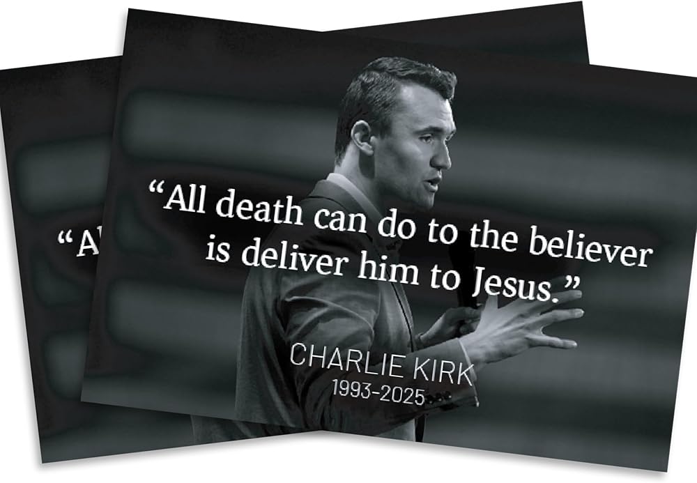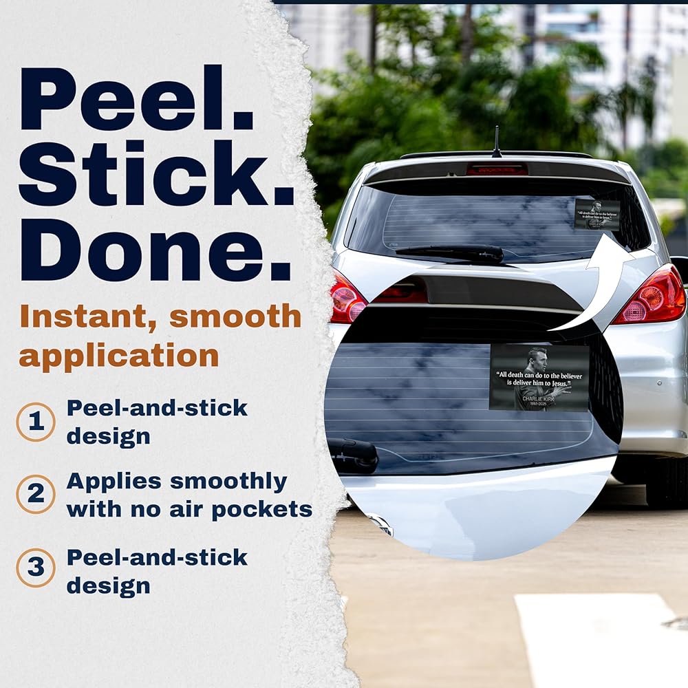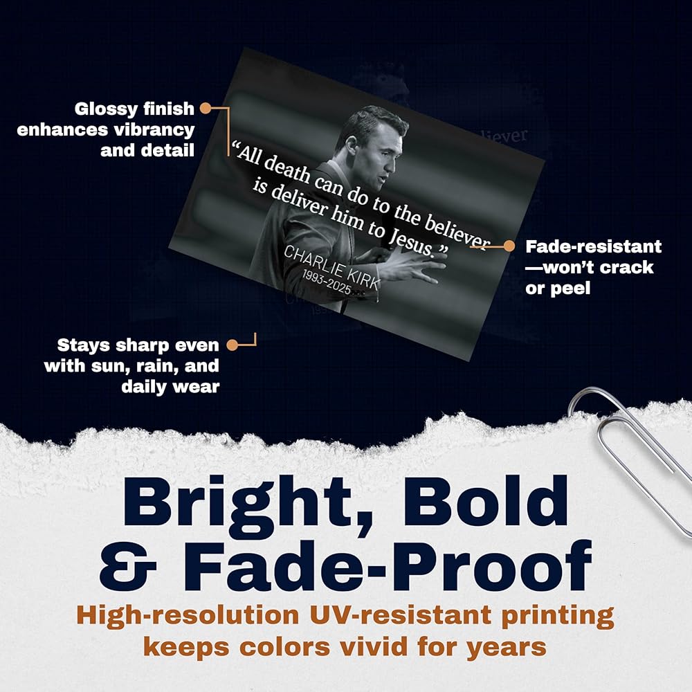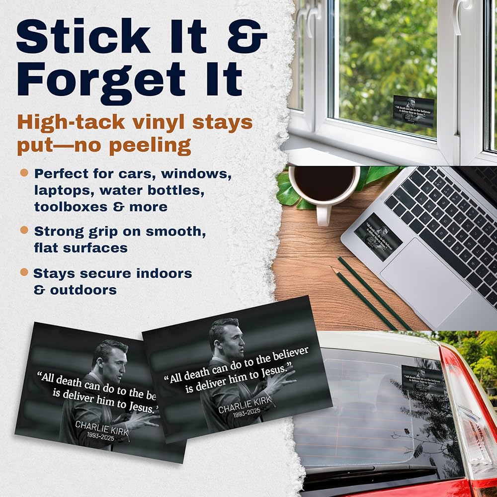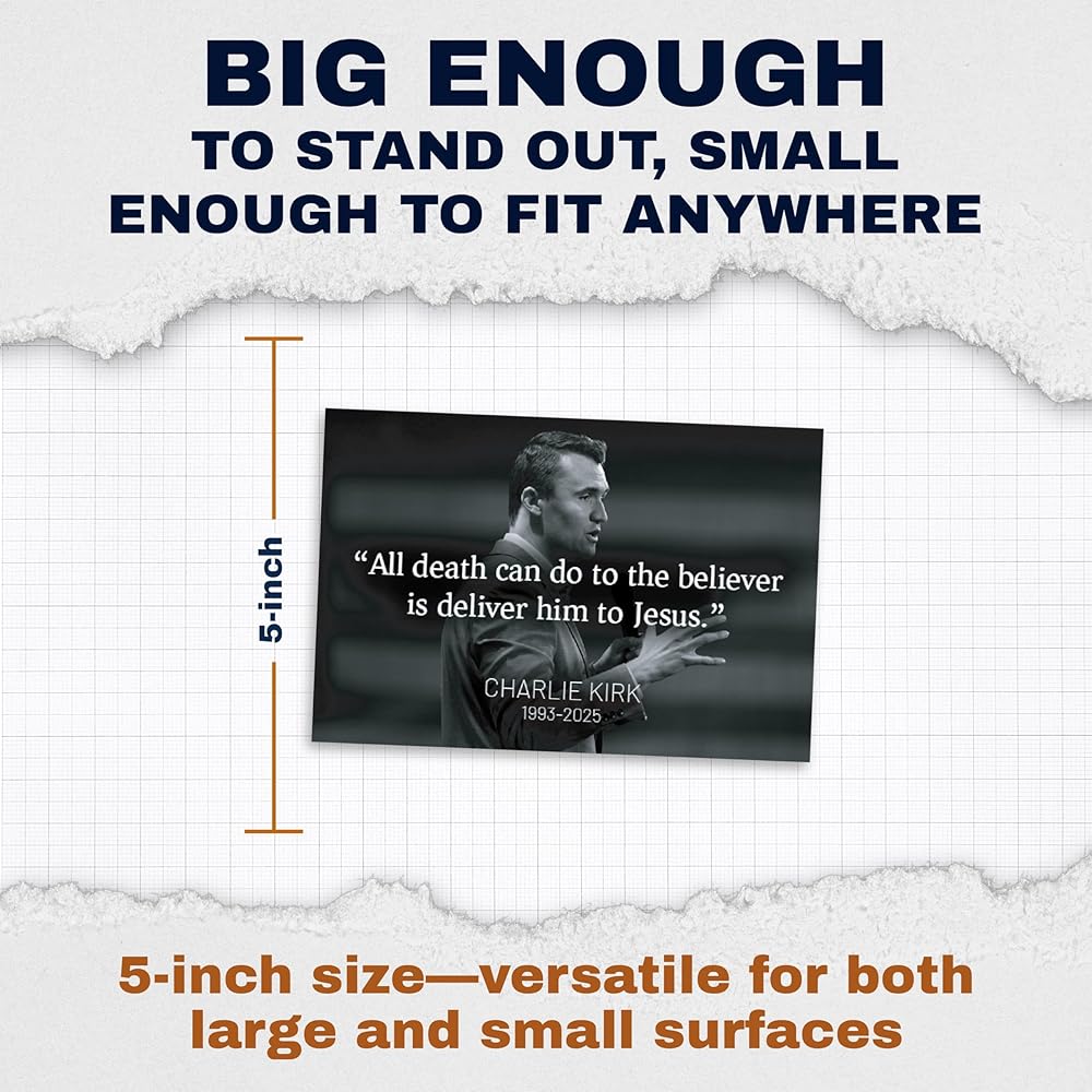 Honor the memory of Charlie Kirk with this RIP Memorial Tribute Sticker 2 Pack. Each sticker measures 5 inches and is crafted from durable vinyl, making it a lasting tribute you can proudly display. Designed to be waterproof and fade-resistant, these stickers hold up against the elements, whether placed indoors or outdoors. With a clean and respectful design, these memorial stickers are a meaningful way to express remembrance and tribute. They can be applied to laptops, water bottles, lockers, vehicles, or any smooth surface, serving as a daily reminder of legacy and impact. This 2-pack provides added value and flexibility, so you can share one with a friend or keep both for personal use. Easy to apply and long-lasting, these stickers are made to stay vibrant over time, offering a simple yet heartfelt memorial keepsake.
