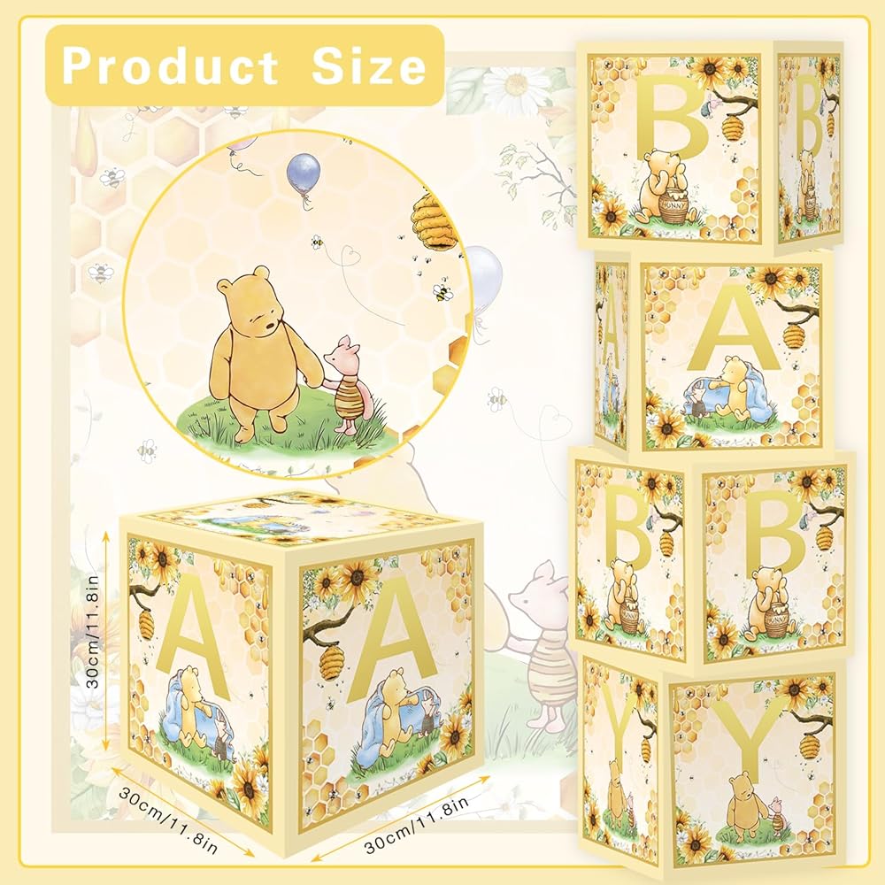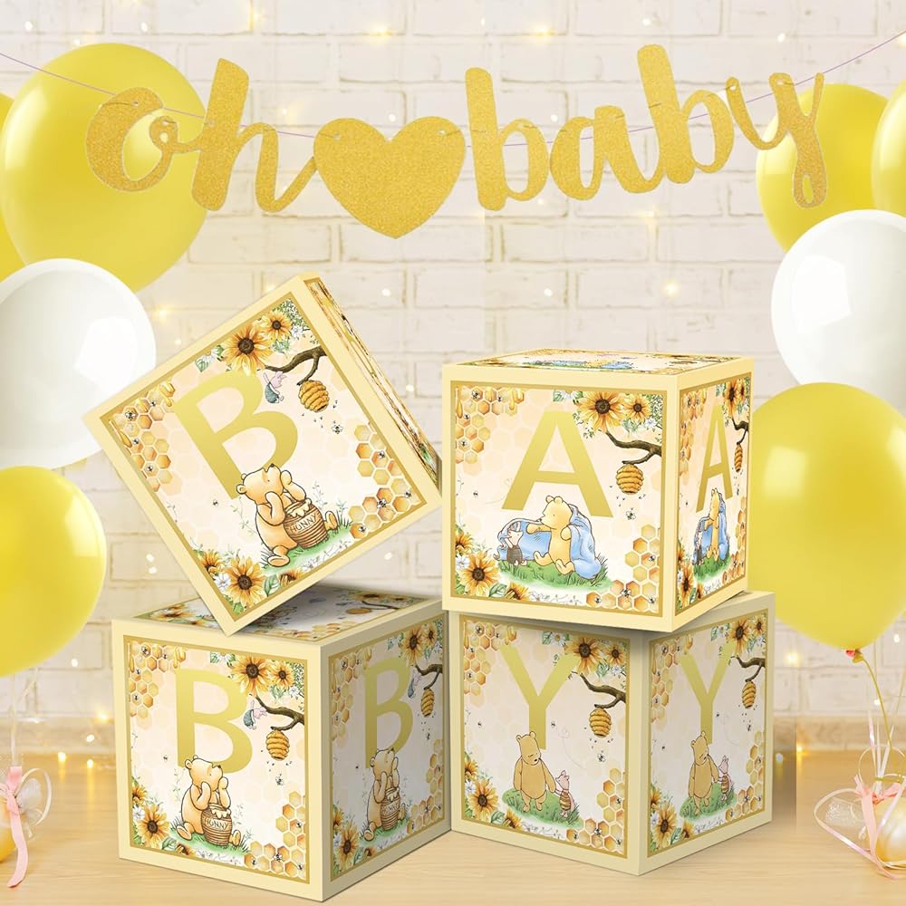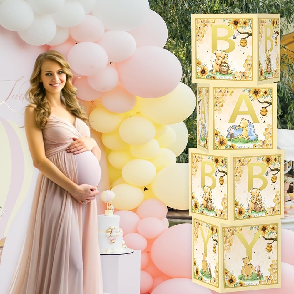 Classic Baby Shower Boxes Party Decorations - 4 Blocks With Baby Shower Decorations ,First Birthday Centerpiece Decor, Bear Baby Shower Supplies, Gender Reveal Backdrop