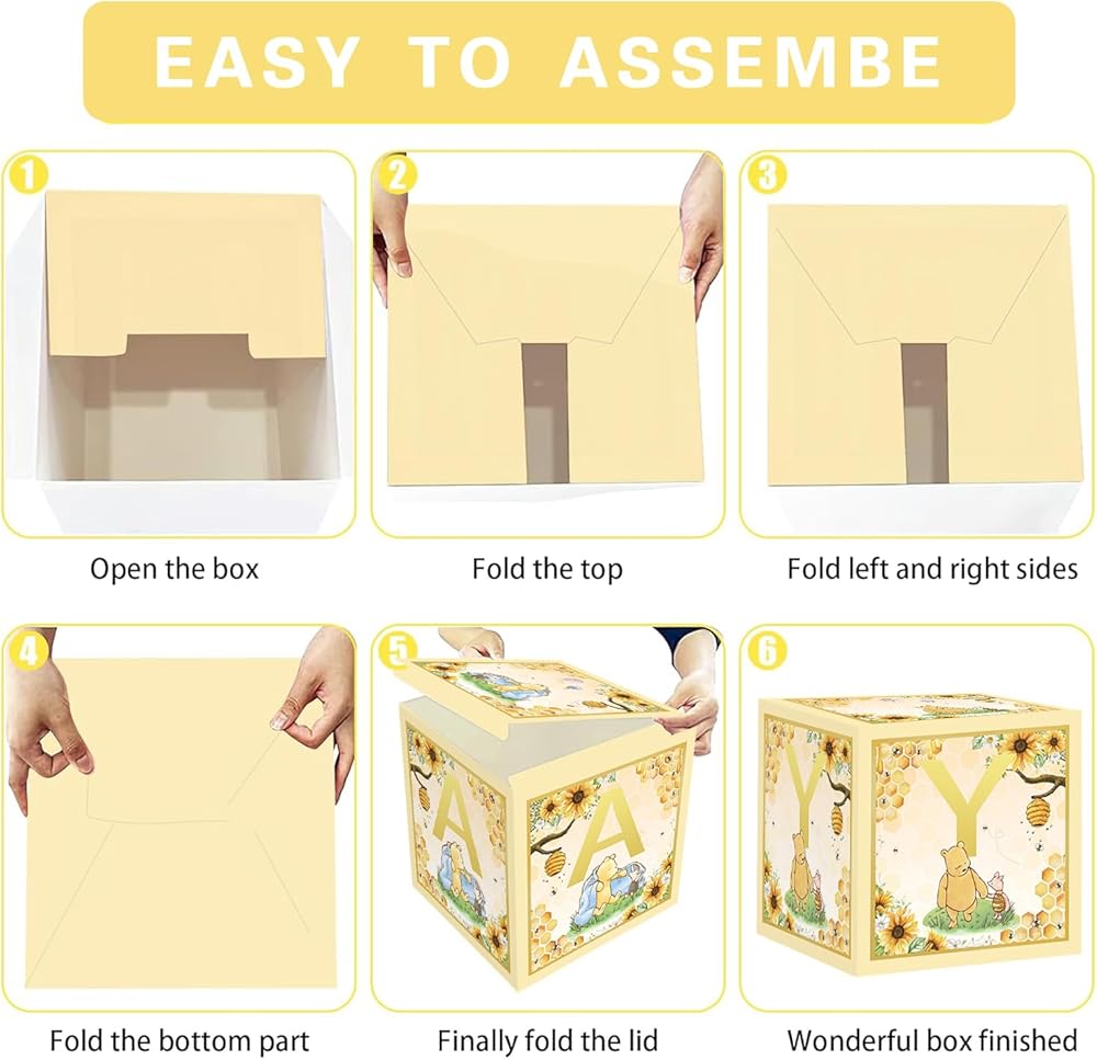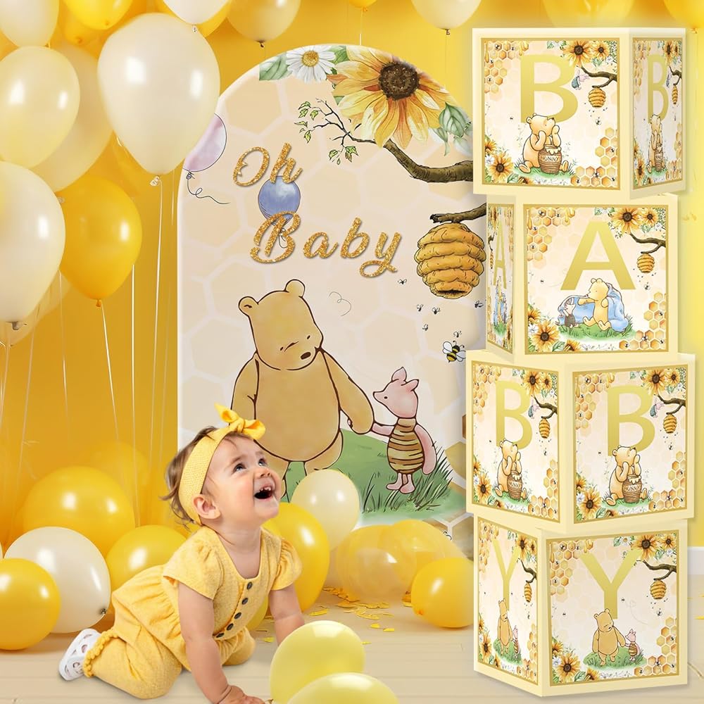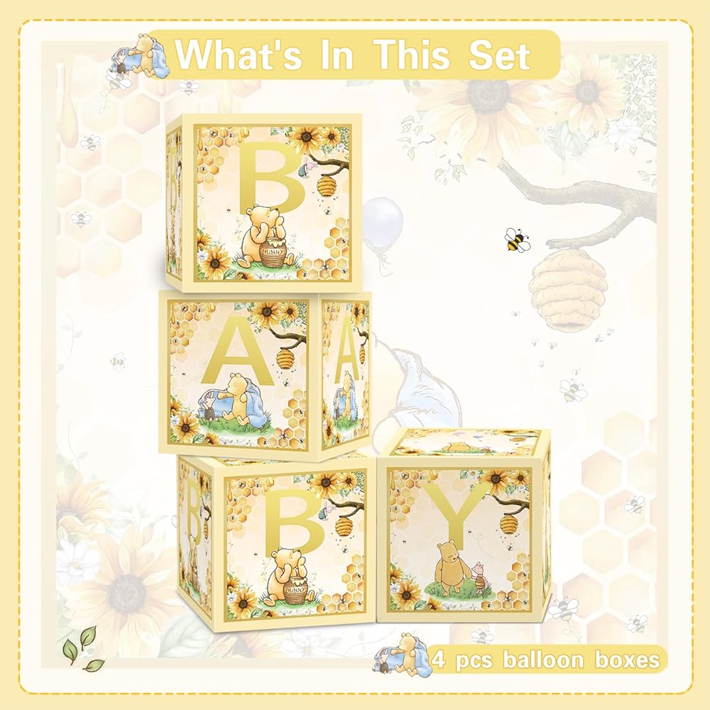 Baby Shower Box Set Includes Open the package and you will receive a set of Yellow 4pcs 11.8-inch gift boxes, a classic Bear Baby themed shower party gift box.