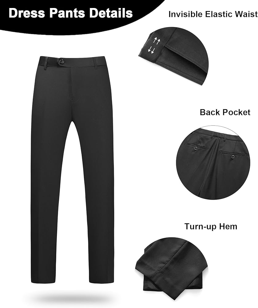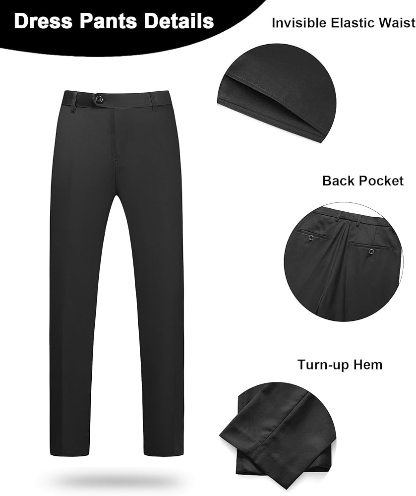 Classic Design: This two-button single-breasted suit blazer features a notched lapel and double side vents. 4 cufflinks on each side. 1 real pocket on the chest. 2 flap practical pockets. 2 practical inside pockets. Dress Pants: Flat-front design. With an elasticated waistband. Two slash pockets and two back pockets.