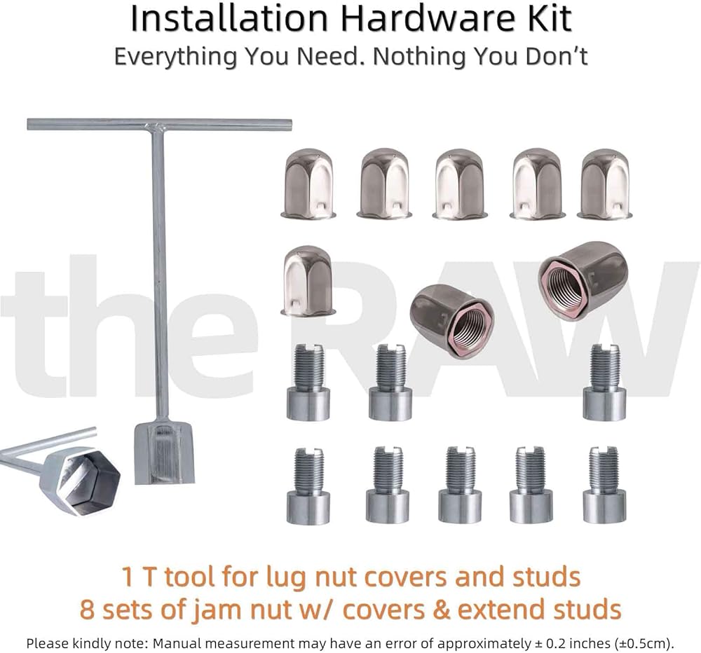 - Kit includes: 2 sets of front wheel covers, 2 sets of rear wheel covers, mounting hardware, installation tool