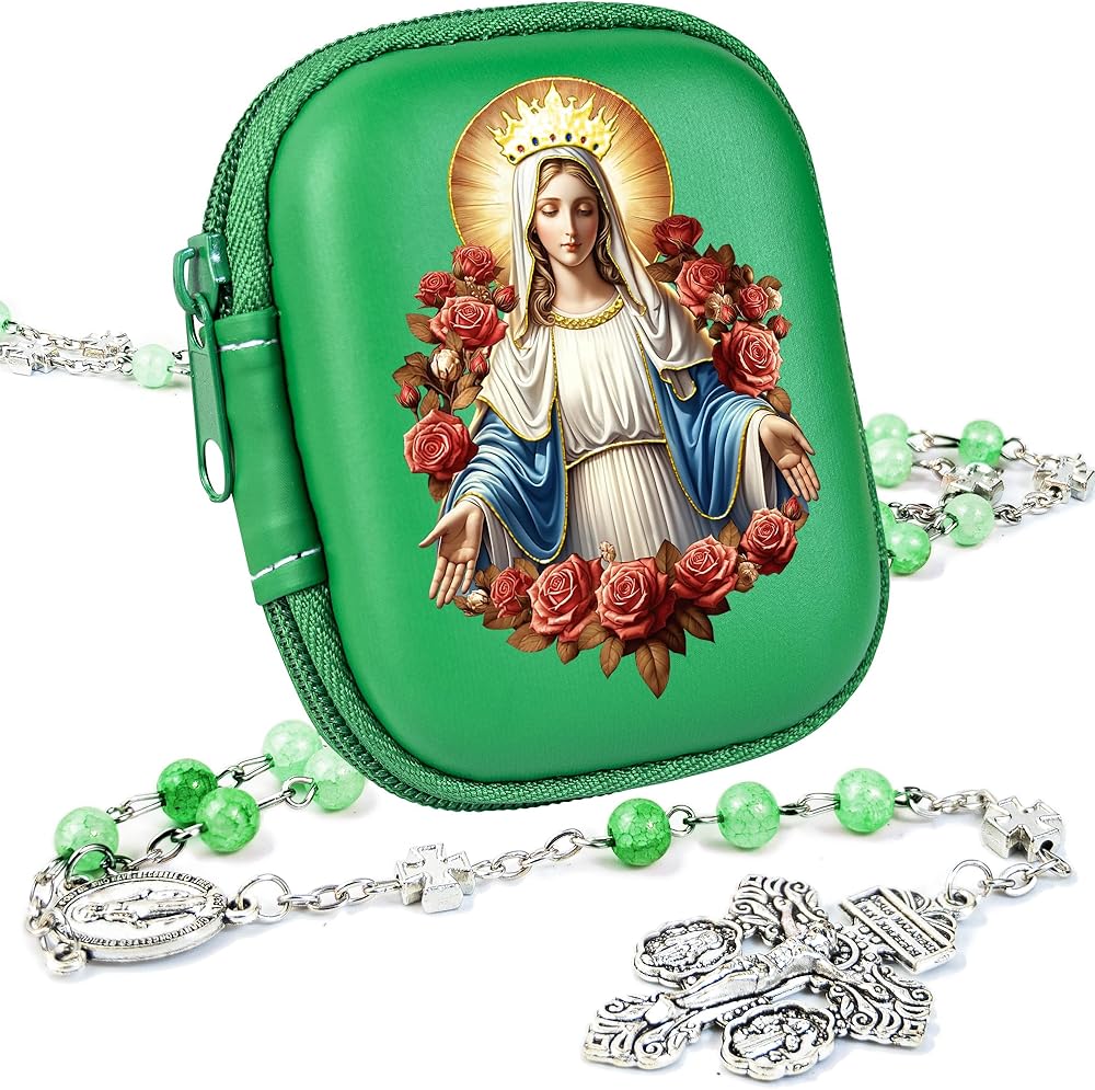 This Catholic rosary comes in a sturdy zippered box printed with the Virgin Mary's image