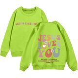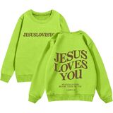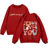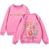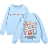 This comfortable sweatshirt, suitable for both boys and girls, features the words “Jesus Loves You” on the front and “God's Love Never Fails” on the back, making it the perfect choice for religious occasions.