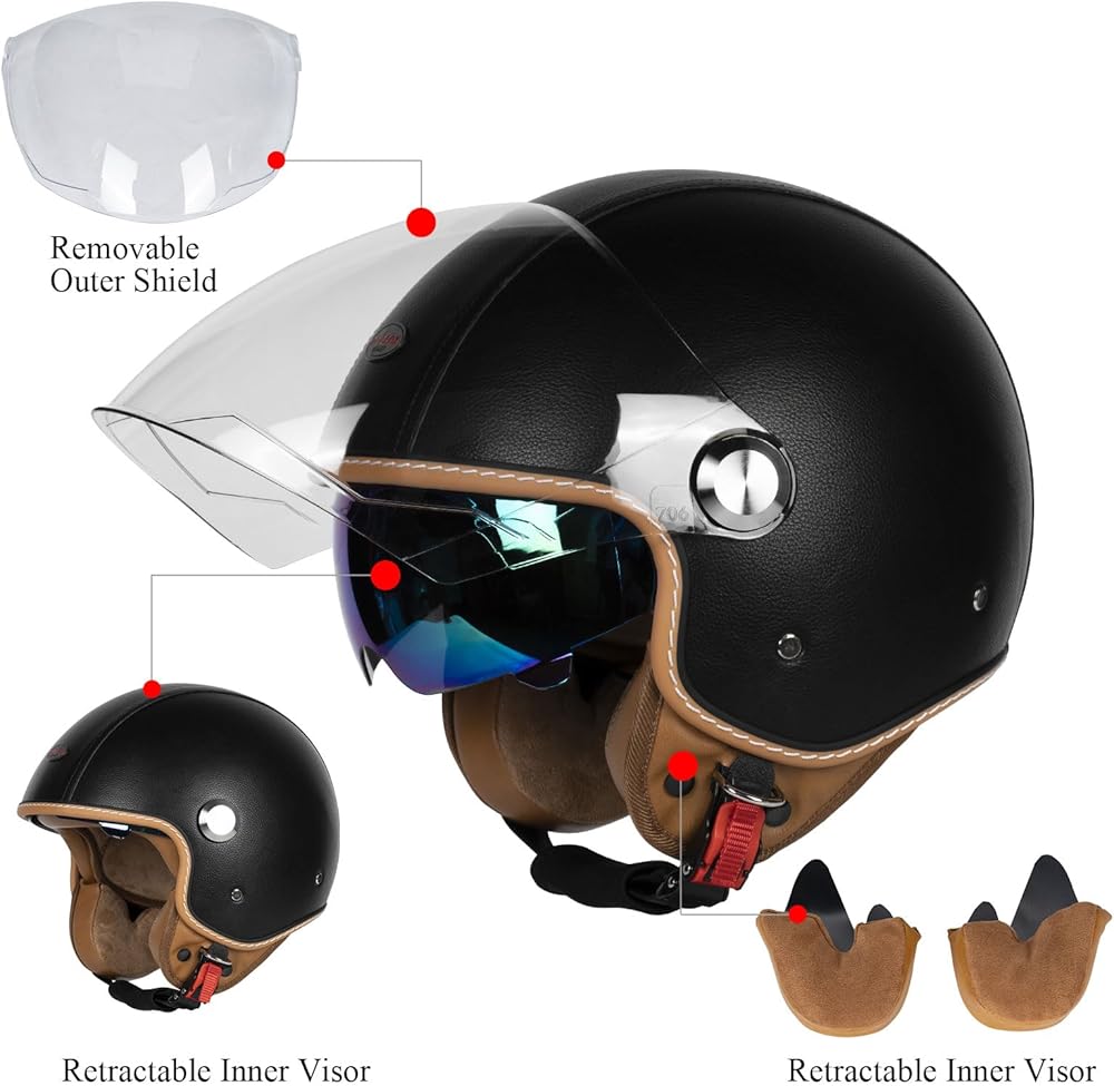 تصميم Dual Sun Visor : مجهز بأقنعة مزدوجة ، تشمل خوذة الدراجات النارية للبالغين حجارة خارجي واضحة للرؤية الواسعة ، وحظر المخلوقات الريح والمخلوقات الطيران ، في حين أن الحجارة الداخلية الملونة تضمن الحماية من أشعة الشمس الصارخة ، مما يلغي الحاجة إلى التبديل بين النظارات/النظارات الشمسية/الزواج المليء.