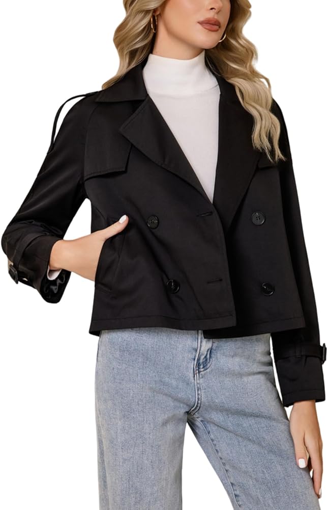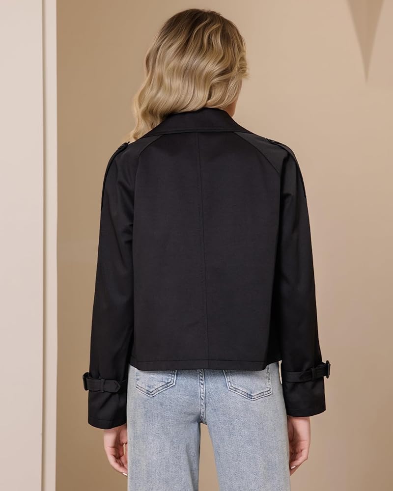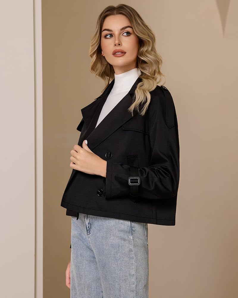 【Features】:The cropped trench coat includes two welt pockets, offering a sleek and uncluttered design that provides easy access to your essentials. The adjustable cuffs with buckles give you the flexibility to tailor the fit to your wrists, seamlessly blending functionality with fashion. The double-breasted front enhances the coat's visual appeal and contributes to its wind-resistant qualities, ensuring you stay comfortable in breezy conditions.