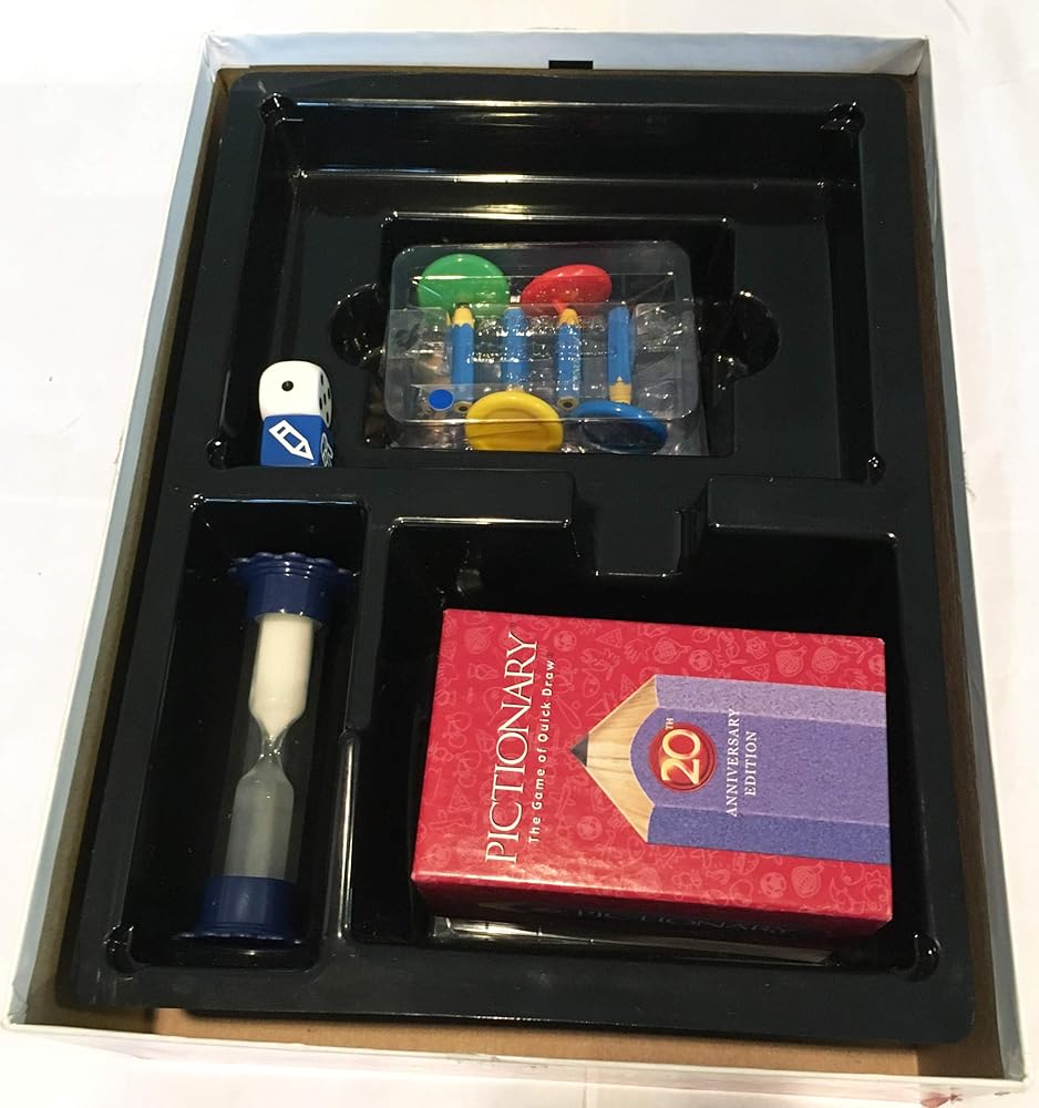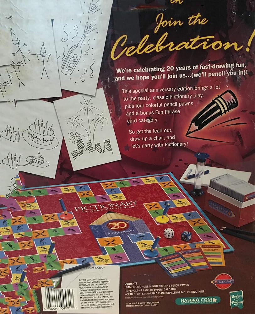 لعبة ذا جيم اوف كويك درو إصدار الذكرى السنوية العشرين من بيكشنري هي منتج قابل للتجميع بحالة ممتازة مملوكة مسبقًا. إنه جيد للأعمار من 12 سنة فما فوق مع 3 لاعبين أو أكثر. يجلب إصدار الذكرى السنوية الخاص الكثير إلى الحفلة: اللعب التصويري الكلاسيكي، بالإضافة إلى أربعة بيادق أقلام ملونة وفئة بطاقات عبارات ممتعة إضافية. لذا احصل على زمام المبادرة، ارسم كرسي، ودعنا نحتفل مع بيكشناري!