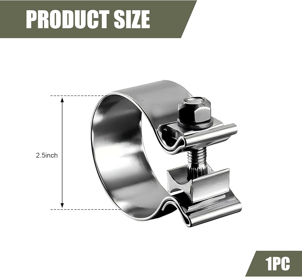 Function: This exhaust clamp is designed to connect 2.5 " outer diameter pipes with inner diameter pipes, effectively reducing noise and exhaust leaks without flattening the pipes, thereby creating a sturdy and maintainable connection.