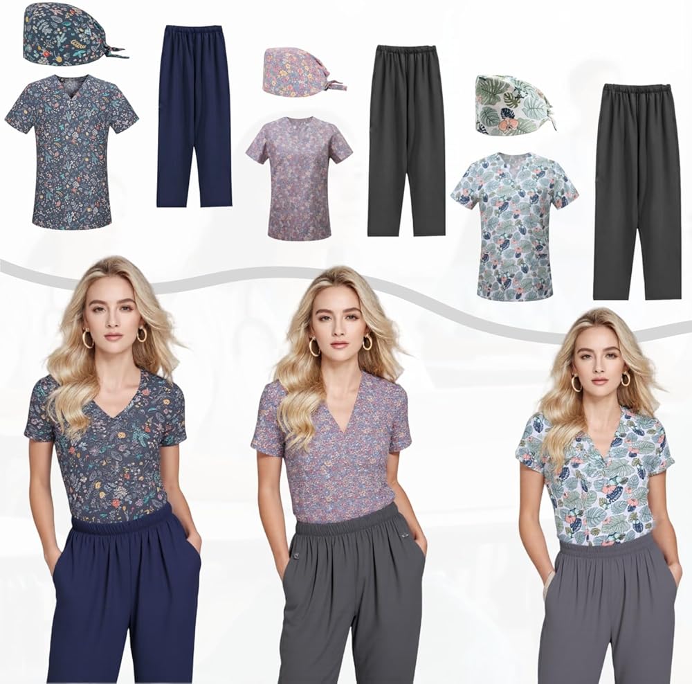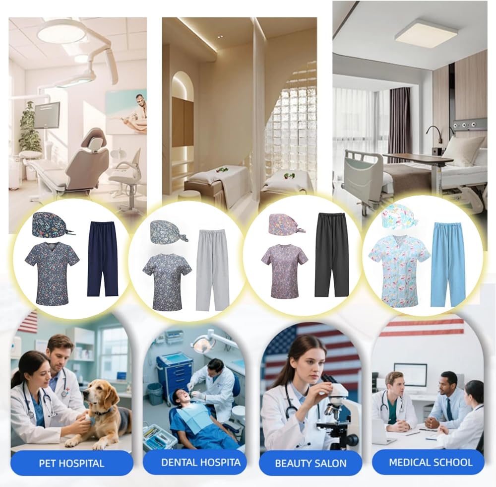 【Printed surgical gown】This women's short-sleeved nurse uniform adopts a printed design with a classic V-neck, which is simple and cute. The top is equipped with 3 practical pockets. It can meet the basic storage needs of staff. You will have plenty of space to store work tools and necessities
