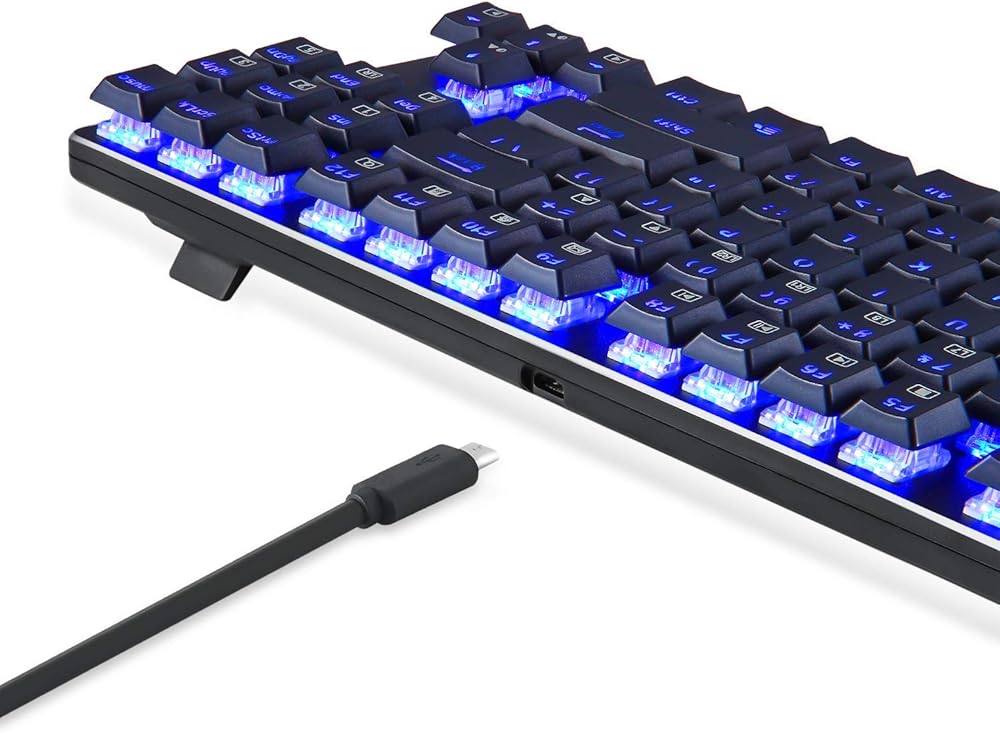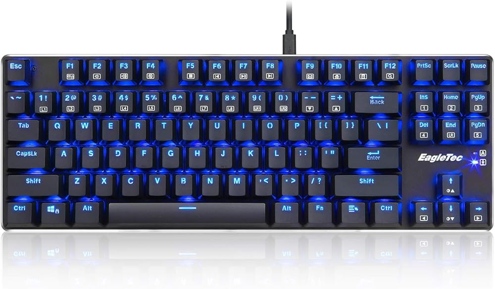 EagleTec EagleTec KG060-BR لوحة مفاتيح ميكانيكية بإضاءة خلفية LED زرقاء، درجة منخفضة 87 مفتاح لوحة مفاتيح USB مع مفاتيح بنية كرزية هادئة للكمبيوتر - (أسود)
