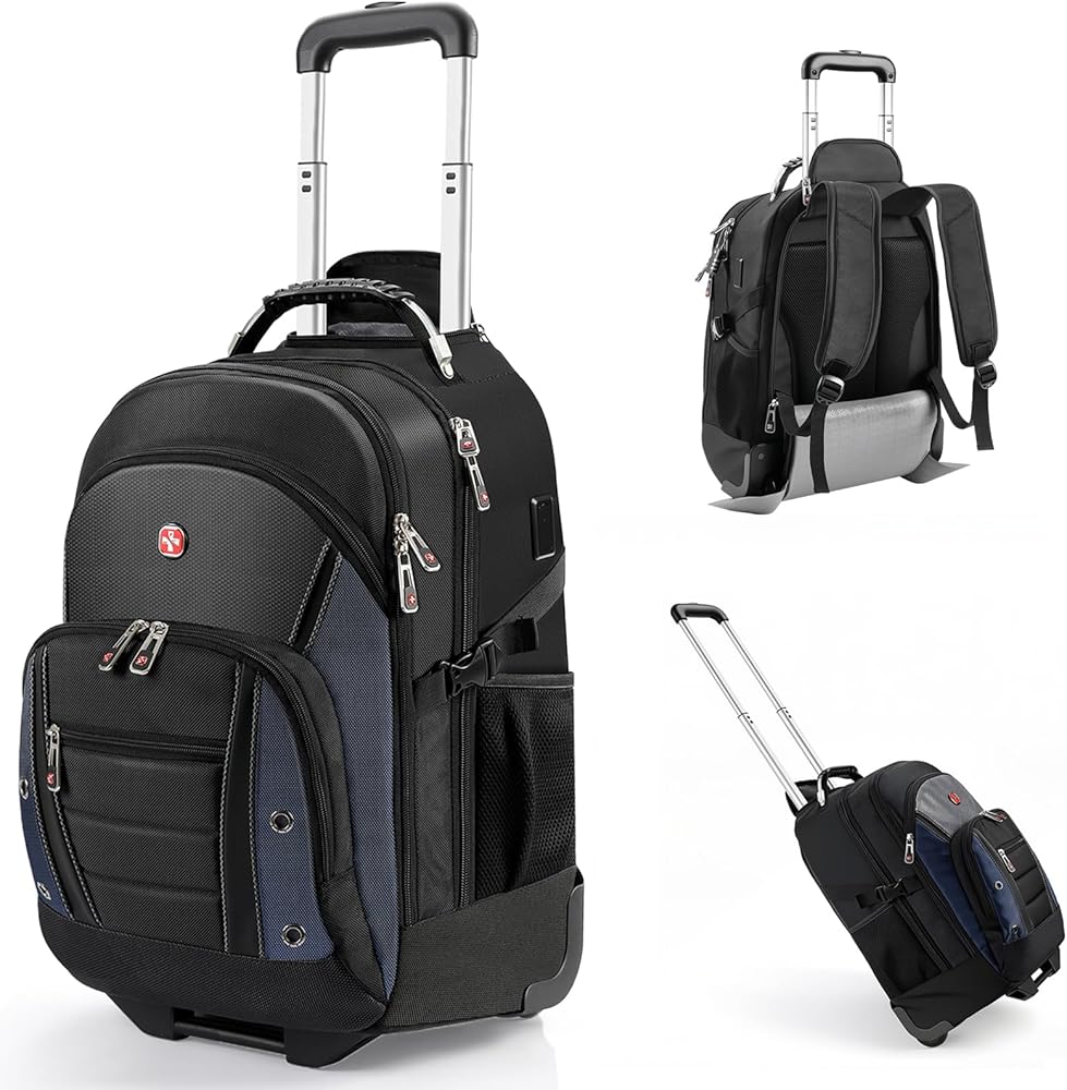 حجم الحمل - معتمد من شركة الطيران، مصمم لتلبية معظم معايير حمل شركات الطيران، حقيبة الظهر ذات العجلات هذه تناسب الصناديق العلوية بسهولة. حقيبة ظهر عملية للمحترفين، وحقيبة ظهر أنيقة للطلاب، وواحدة من أفضل حقائب الظهر المتدحرجة للسفر التي يمكنك الاعتماد عليها.