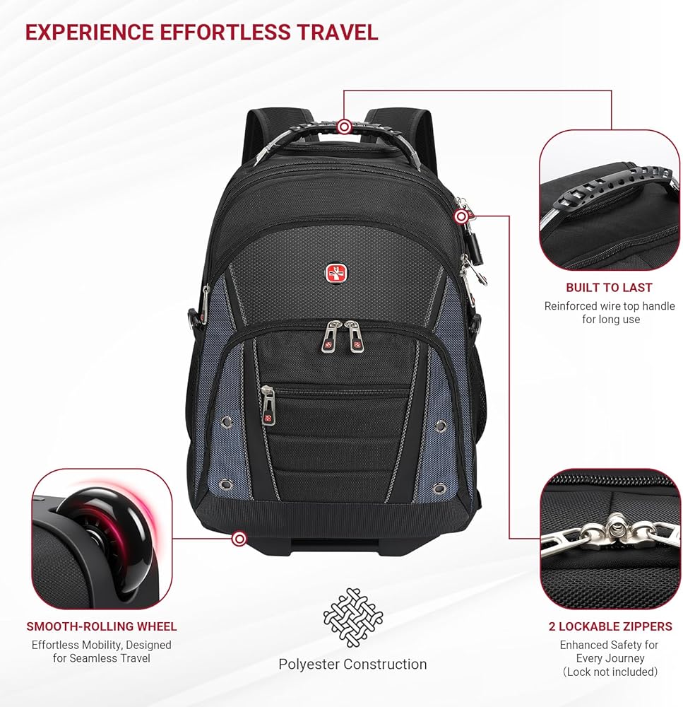 مادة متينة وخيار قفل TSA مصنوع من البوليستر المقاوم للماء، وخياطة معززة، وعجلات ناعمة محمية بالمطاط من أجل المتانة. توفر السحابات القابلة للقفل والقفل الجمركي الاختياري TSA راحة البال، مما يجعلها حقيبة ظهر ذات عجلات يمكن الاعتماد عليها للسفر والتنقل اليومي على حد سواء.