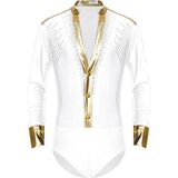 Mens Metallic Shiny Rhinestones Latin Tuxedo Leotard Bodysuit Gymnastics Figure Skating Samba Ballroom Jazz Dance Body Tops(White,XL) in Kuwait