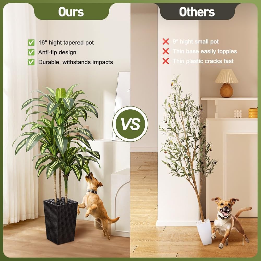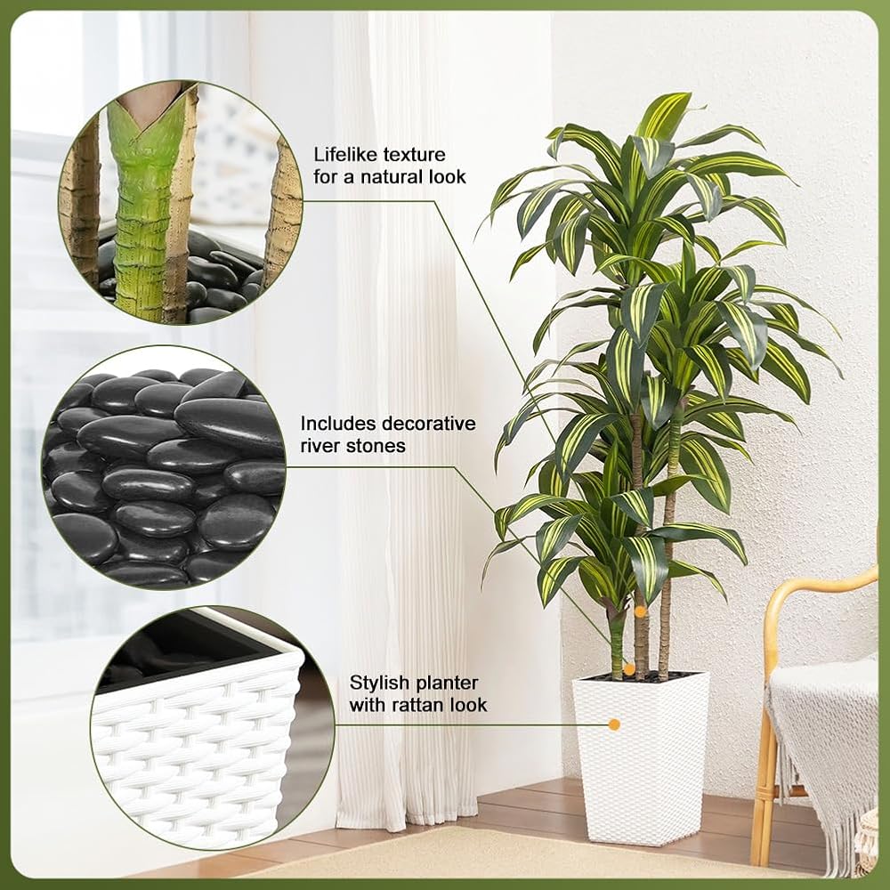 Includes Sturdy Planter and River Rocks: This faux tree comes with a thick, durable planter that is unbreakable. Decorative river rocks enhance the look while helping keep this tall fake plant stable in any space and preventing it from tipping over