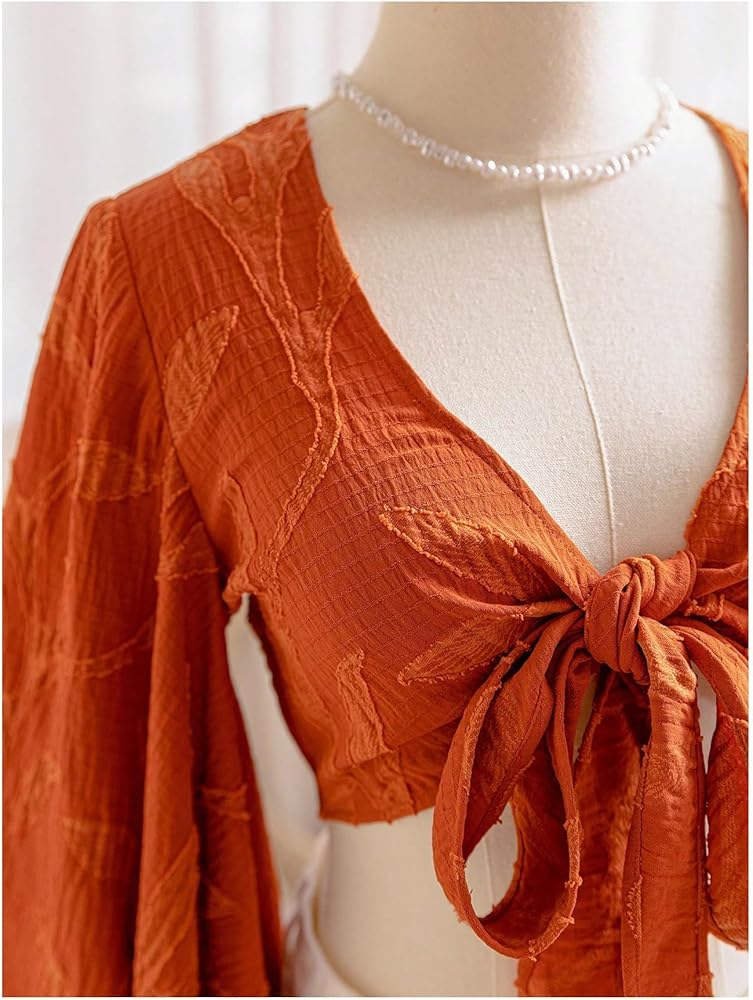 Features: The crop top is featured with floral pattern and ruffle design, which is stylish and eye-catching. The v neck blouse is designed with three quarter length flared bell sleeves and knot front design, providing a fashion, trendy and casual outfits. The top is a must-have clothing in your wardrobe.