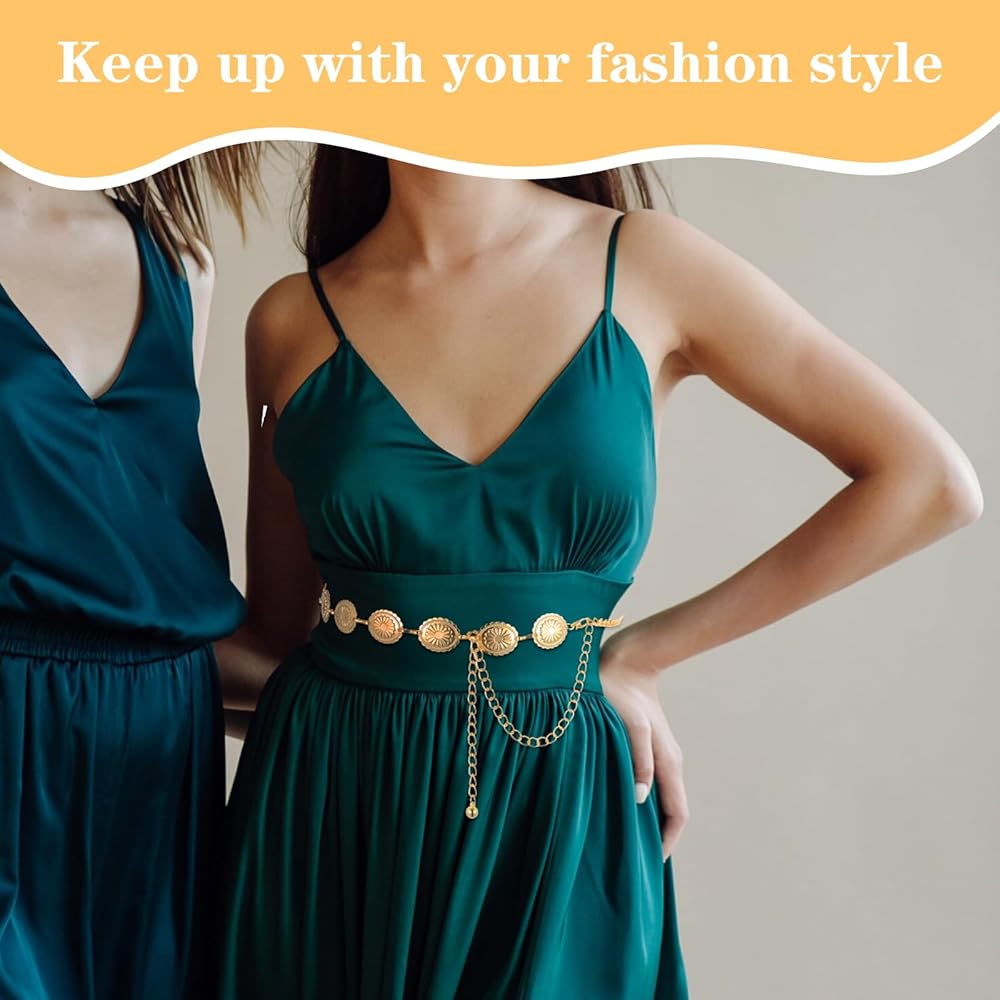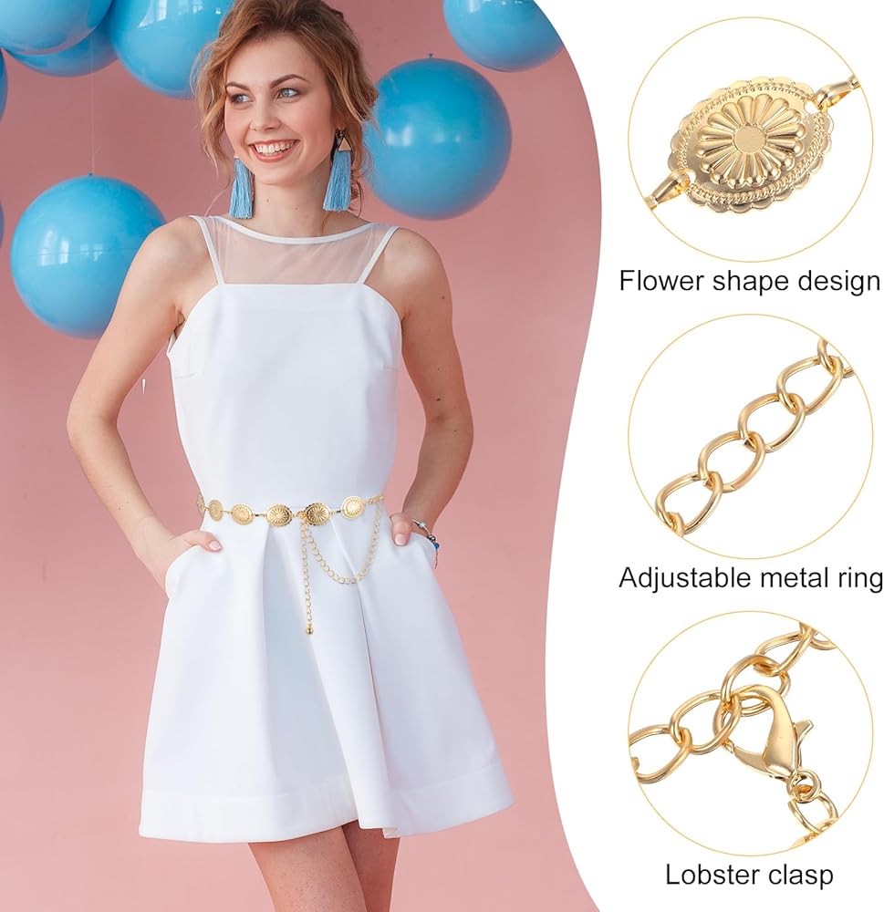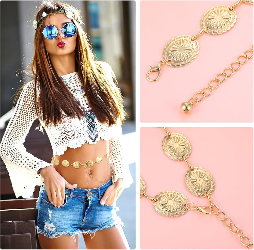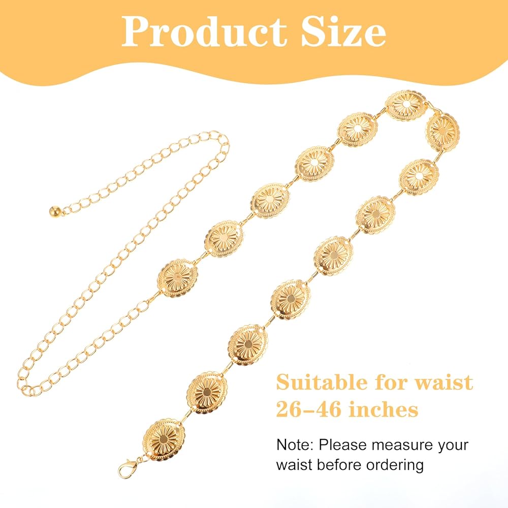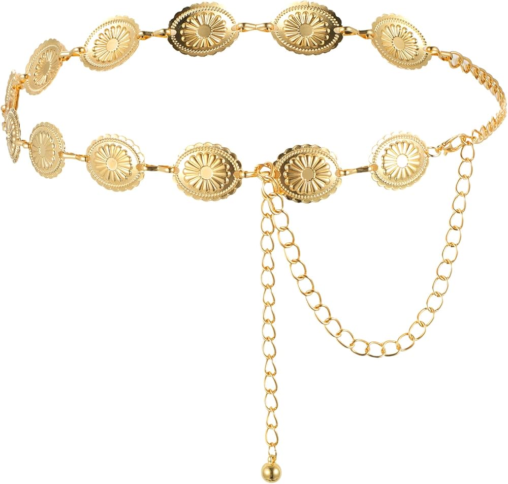 الحزام الغربي للنساء، سلسلة حزام كونتشوس الذهبية مجوفة من ديزي بوهو راعية البقر وأحزمة سلسلة الخصر قابلة للتعديل وصلة معدنية للنساء فساتين الجينز (47.24 بوصة)