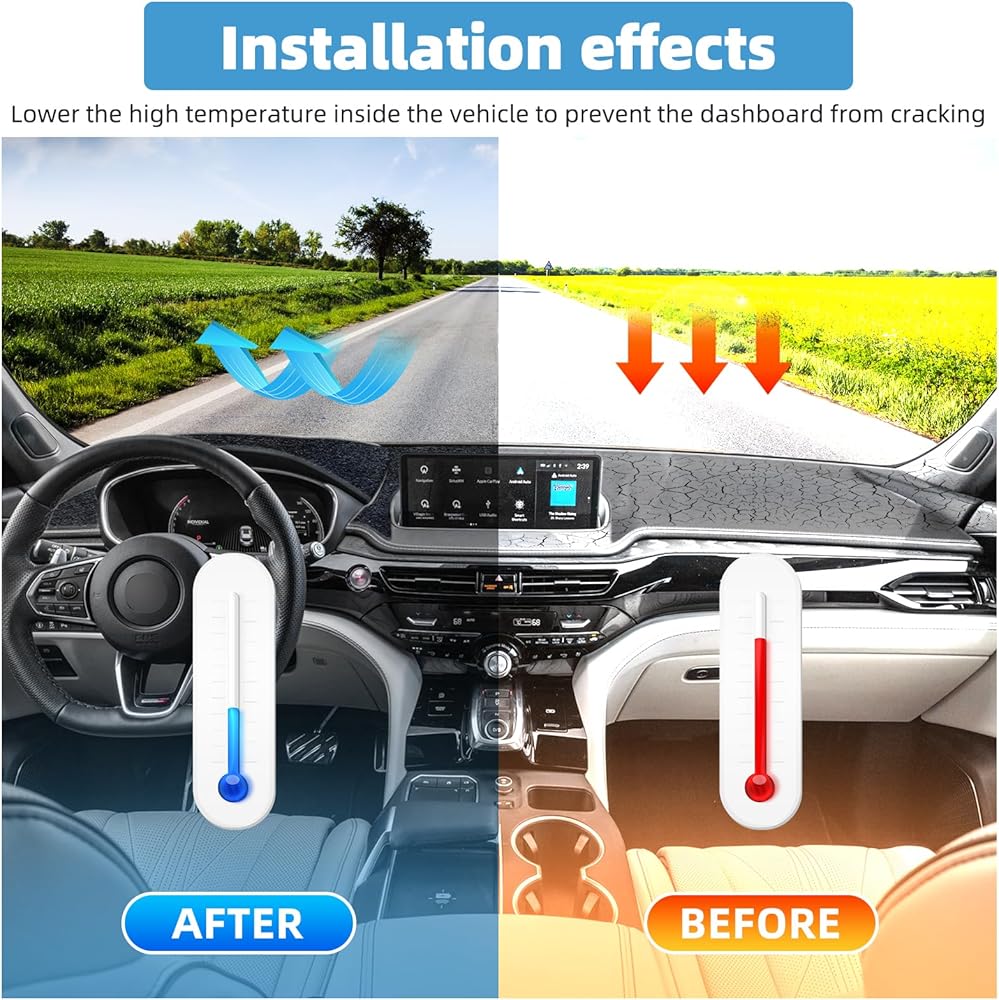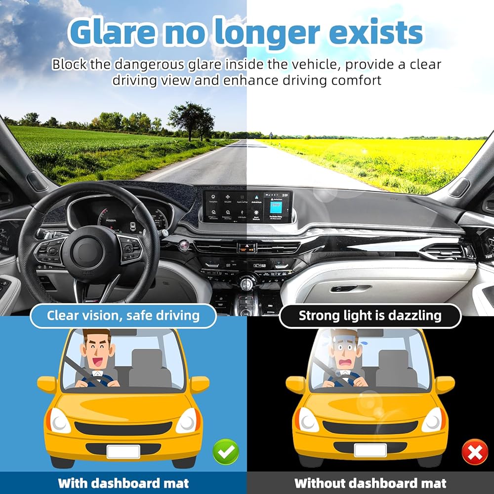 وظائف متعددة: قم بترقية حصيرة غطاء لوحة القيادة لسيارتك المحبوبة. يمكن أن يقلل بشكل فعال من الوهج الخطير للزجاج الأمامي ويوفر رؤية قيادة أكثر أمانًا، ويحمي لوحة أجهزة القياس الخاصة بك من الأضرار والخدوش الناجمة عن حرارة الشمس العالية ويمنعها من الشيخوخة والتشقق.